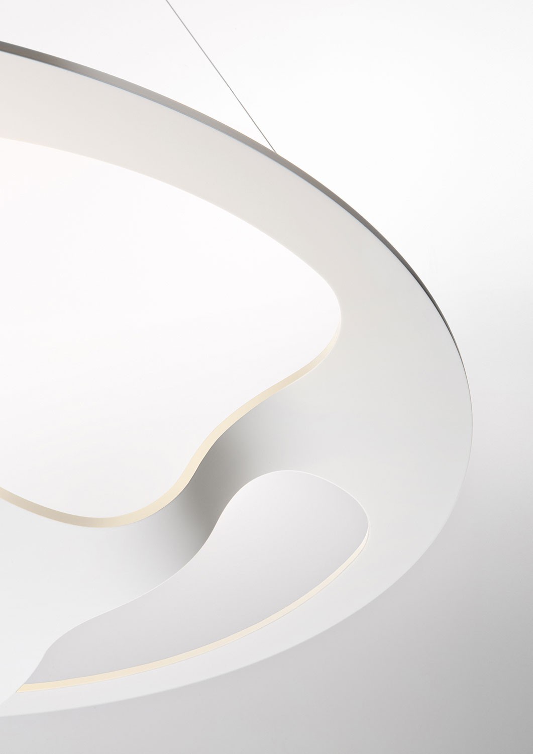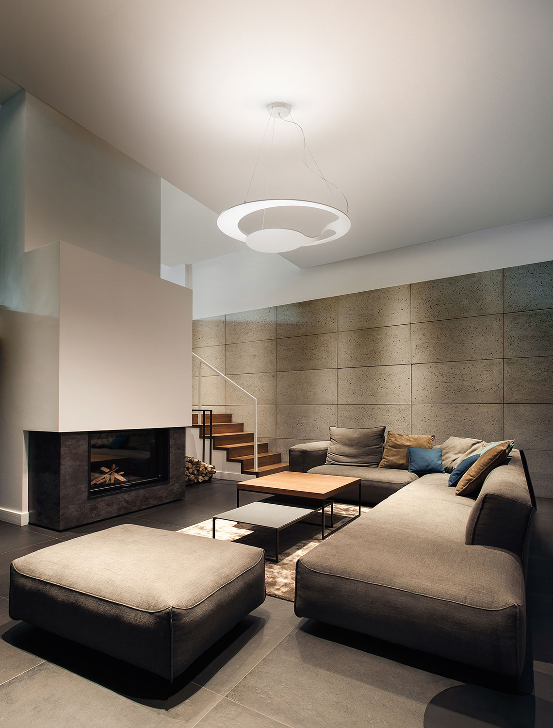 Геометрическая форма алюминиевого диска, полученная с помощью лазера – это успешная составляющая дизайна Glu от Fabbian. Вдохновленный спутниками и орбитами, деликатный и легкий Glu сохраняет идеальный баланс между металлом и воздухом.