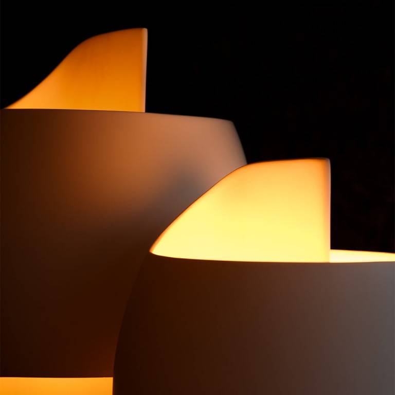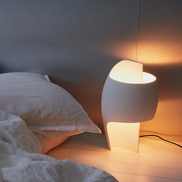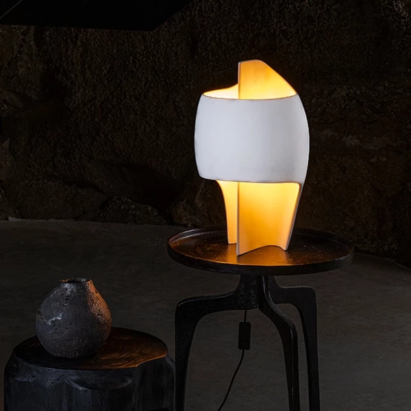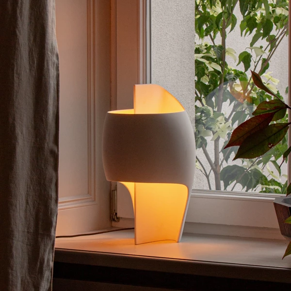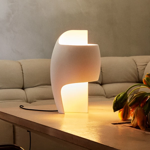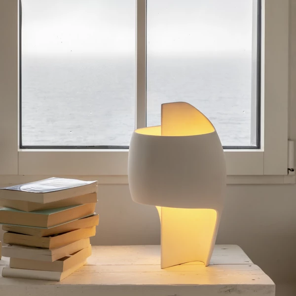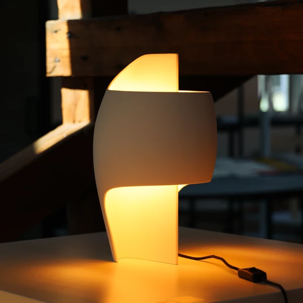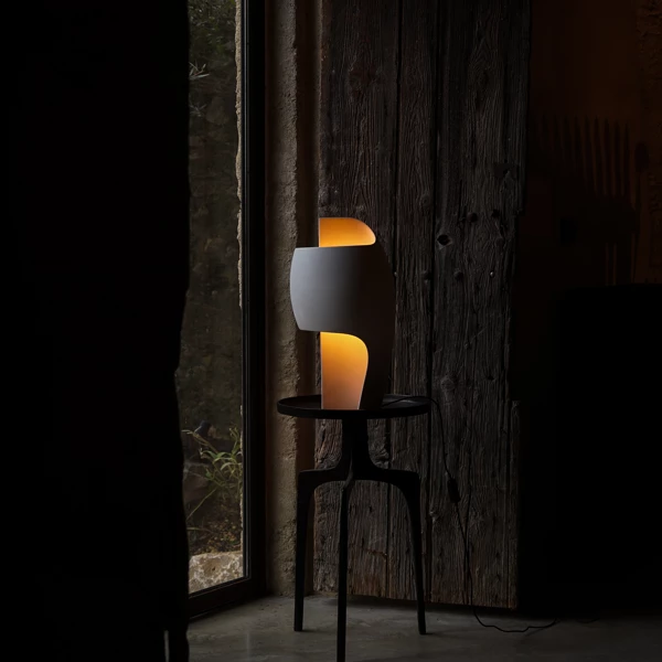 Лампа воплощает в себе мягкость, уют и женственную энергию. Она создана из цельного куска гипса, что придаёт ей особую выразительность и уникальность. Днём лампа выглядит как белая скульптура — спокойная и гармоничная, она олицетворяет внутренний баланс.