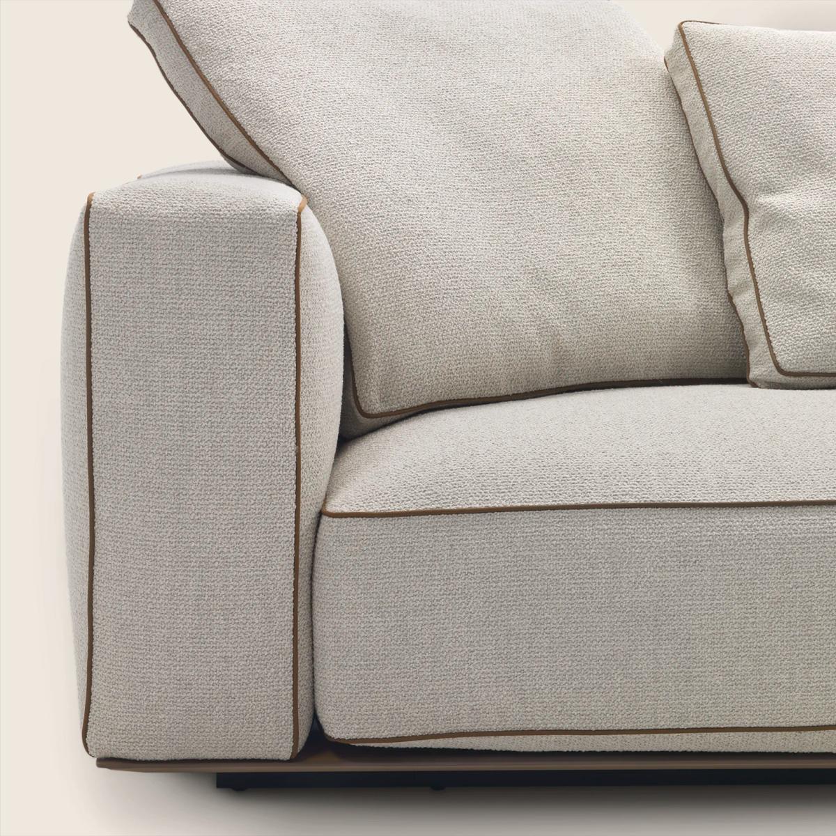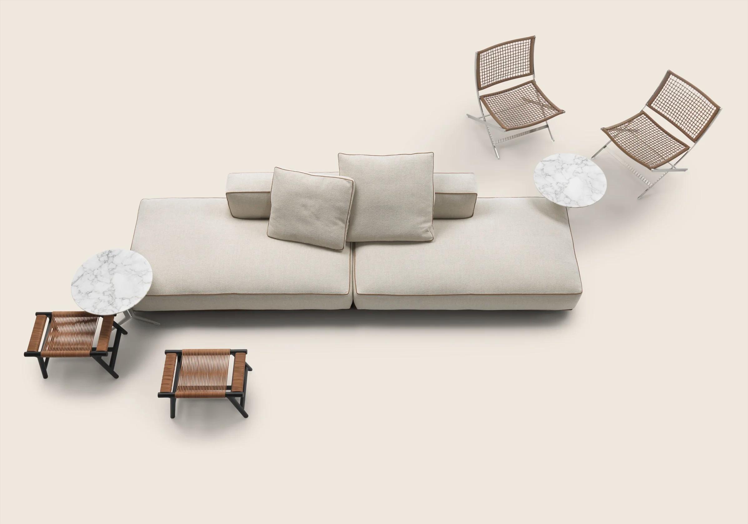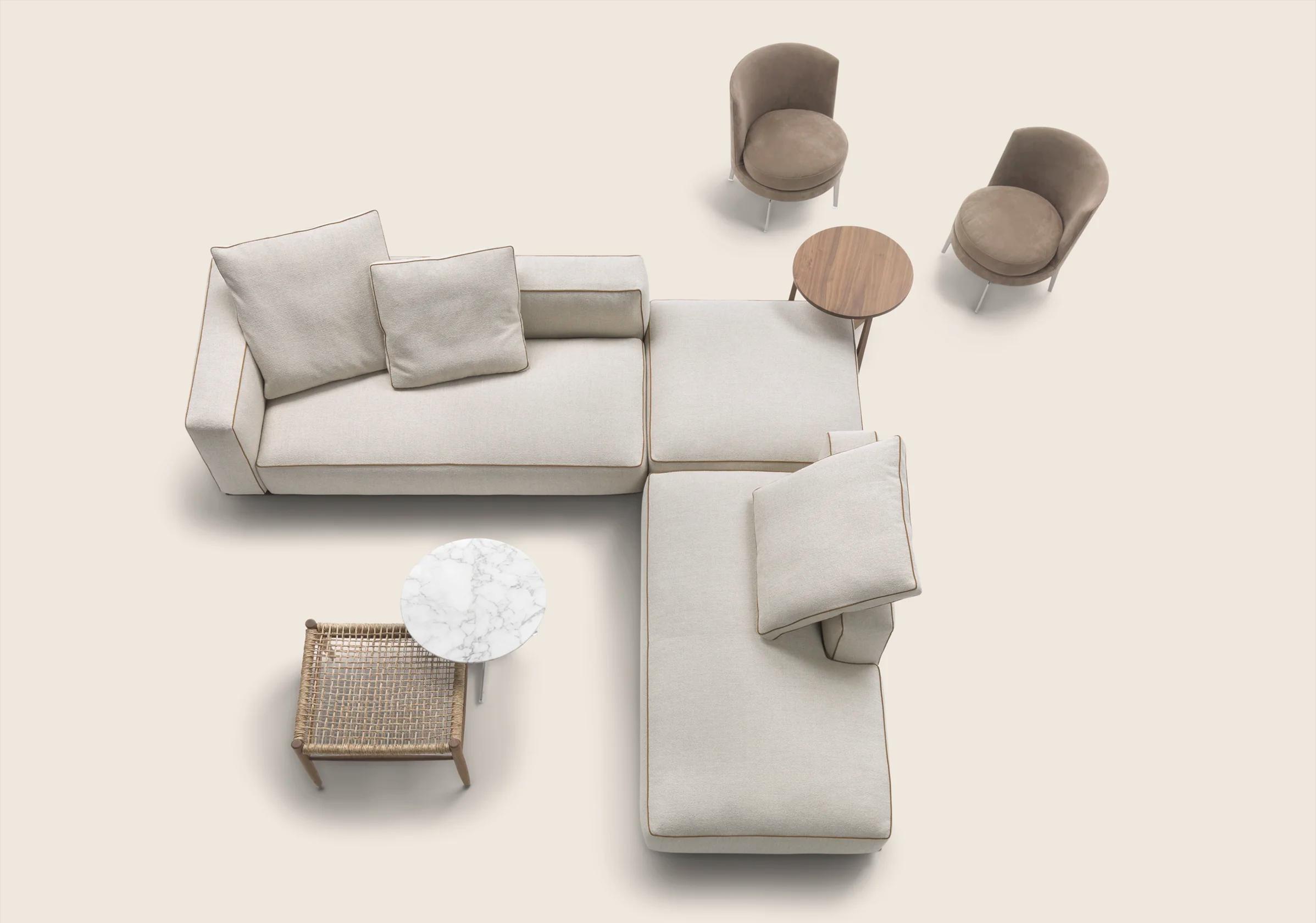 Мягкие геометрические объёмы дивана полностью лишены углов, что придаёт ему плавные и гармоничные линии. Они покоятся на платформе из дерева, обтянутого кожей, что создаёт интересный контраст текстур и материалов.