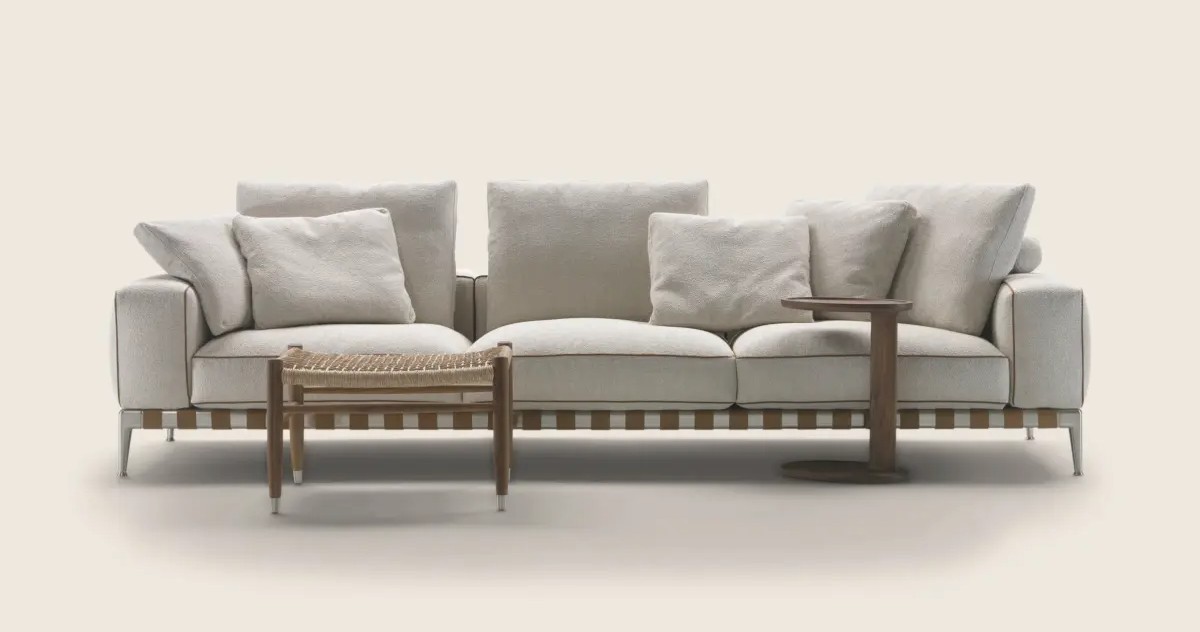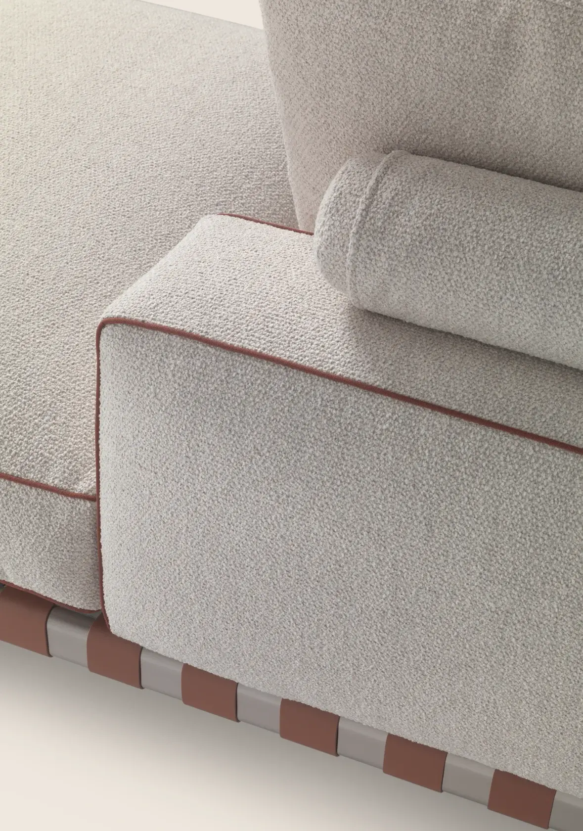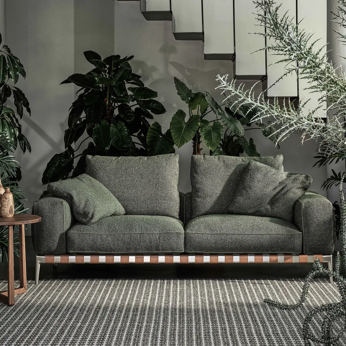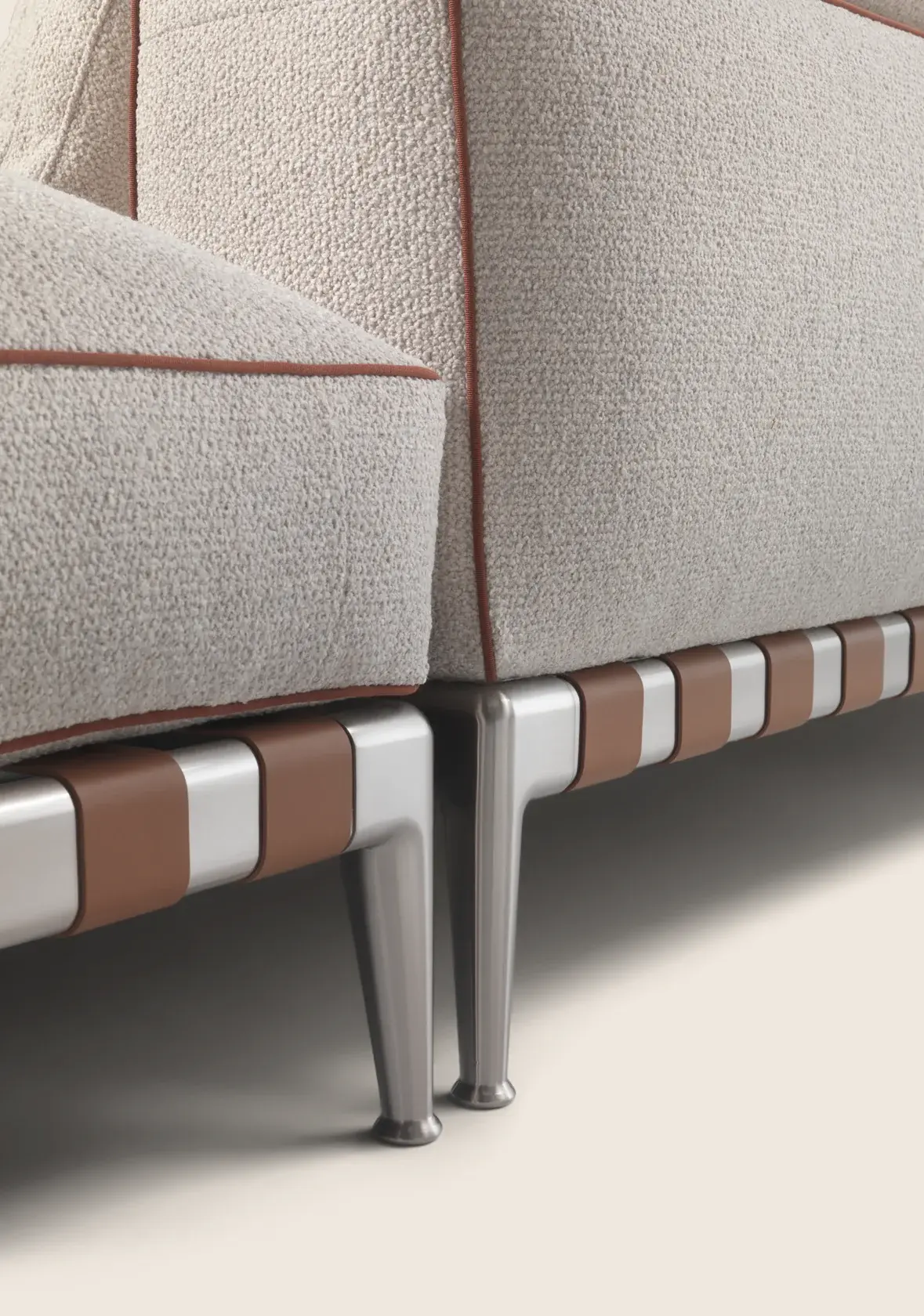 Основание дивана, выполненное из металла, придает конструкции визуальную легкость. Одновременно оно подчеркивает прочность и долговечность изделия. Холодность металла смягчается теплыми оттенками изысканной кожи. Именно ею обтянуты эластичные ремни, поддерживающие подушки сиденья. Этот продуманный контраст добавляет интерьеру глубины. Он также демонстрирует высочайший уровень детализации, характерный для изделий премиум-класса.