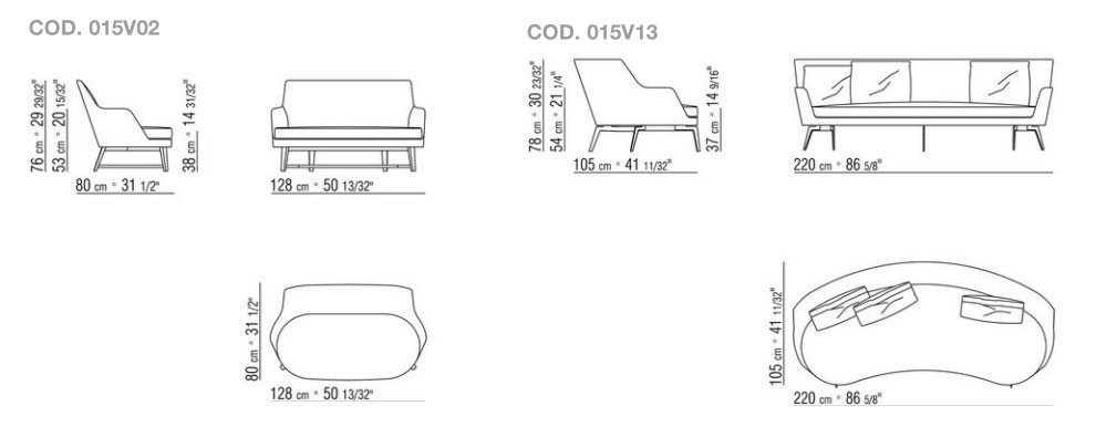 Диван Guscio доступен в двух размерах: длиной 128 см (с основанием из дерева или металла) и длиной 220 см (в этом случае возможно только металлическое основание). Обивка несъёмная и может быть выполнена из ткани или кожи. Выбор ткани зависит от проверки возможности её применения, что гарантирует высокое качество и долговечность дивана.