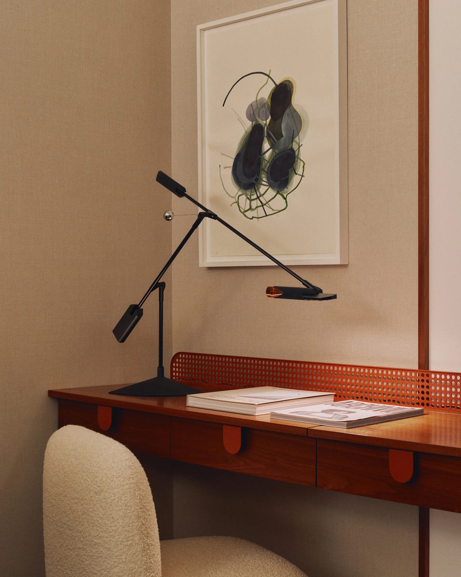 Внутри лампы — не меньше шести шарниров, каждый поворачивается на 360 градусов. Благодаря этому головку можно установить практически в любом положении: она обойдёт все препятствия на столе — книги, блокноты, гаджеты — и направит свет туда, куда нужно.