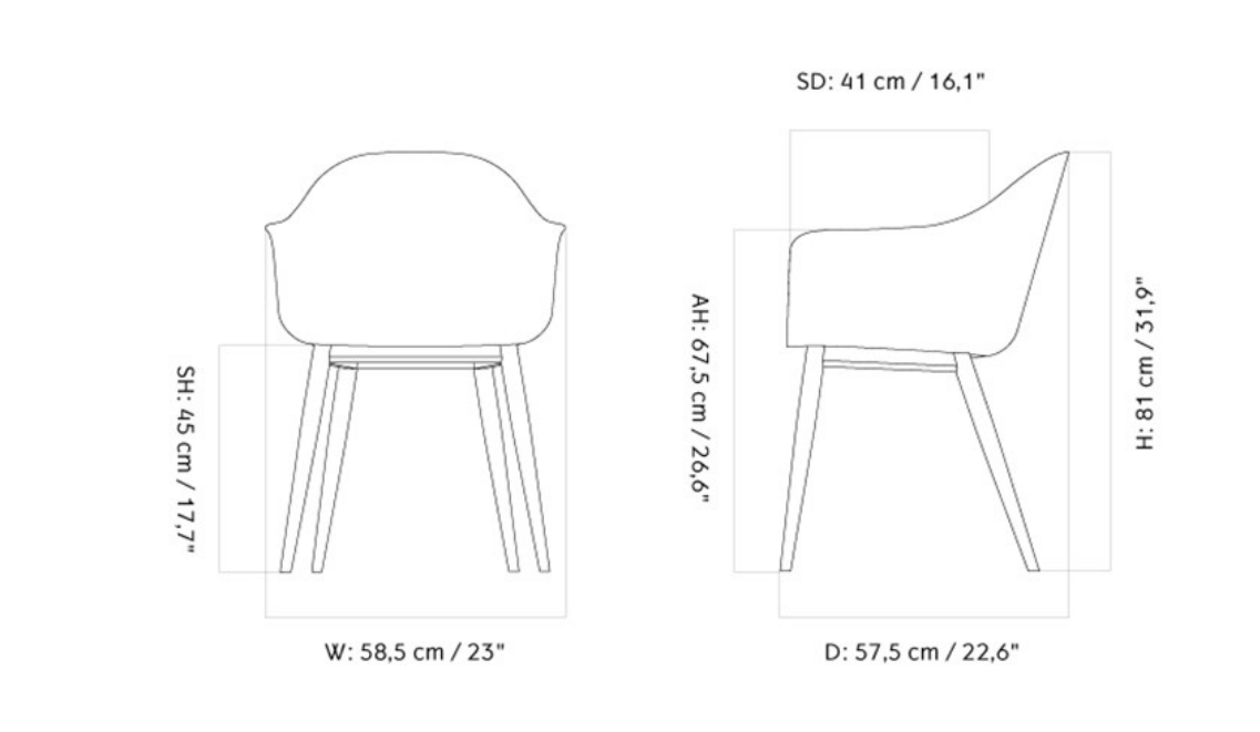 Размеры стула HARBOUR DINING CHAIR следующие: высота составляет 81 см, ширина – 58.5 см, а глубина – 57.5 см. Высота сиденья равна 45 см, глубина сиденья – 41 см, а высота подлокотников – 67.5 см. Благодаря таким размерам, стул подходит для большинства стандартных обеденных столов.