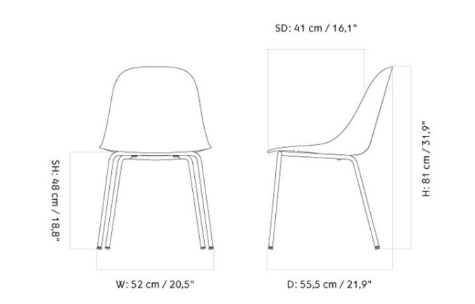 Высота 81 см, ширина 52 см, глубина 55.5 см. Высота сиденья равна 48 см. Глубина сиденья – 41 см. Новая конструкция спинки позволяет легко разместить стул в небольших помещениях. Стул также удобно задвигать под стол.