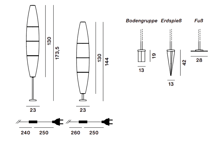 Светильники коллекции Havana состоят из металлического основания и пластикового плафона разных цветов. Дают мягкий, ровный свет и создадут приятную атмосферу в любом интерьере. Созданы специально для улицы. В отличие от внутренней версии с сегментированным абажуром, уличная модель имеет цельный плафон из прочного полиэтилена, полученного методом ротационного формования. Это обеспечивает высокую устойчивость к погодным условиям и ударам. Доступны два размера и три разных типа основания — передвижное основание (Fuß), монтажная панель (Bodengruppe), колышек для грунта (Erdspieß).