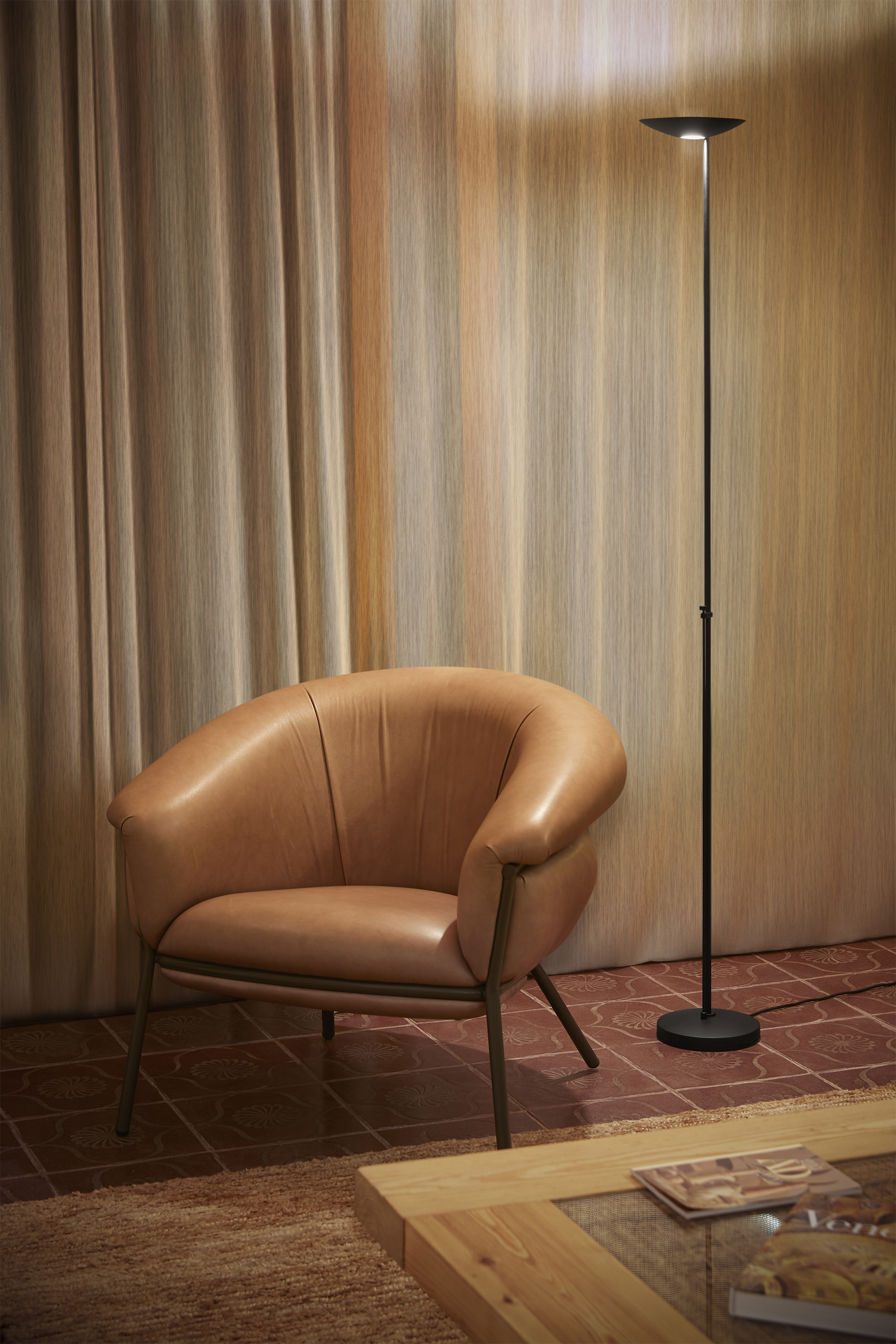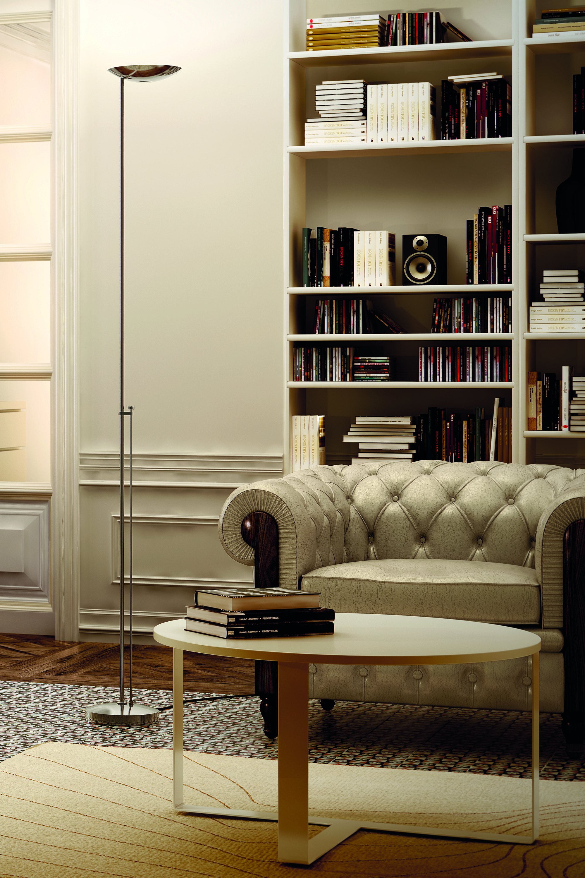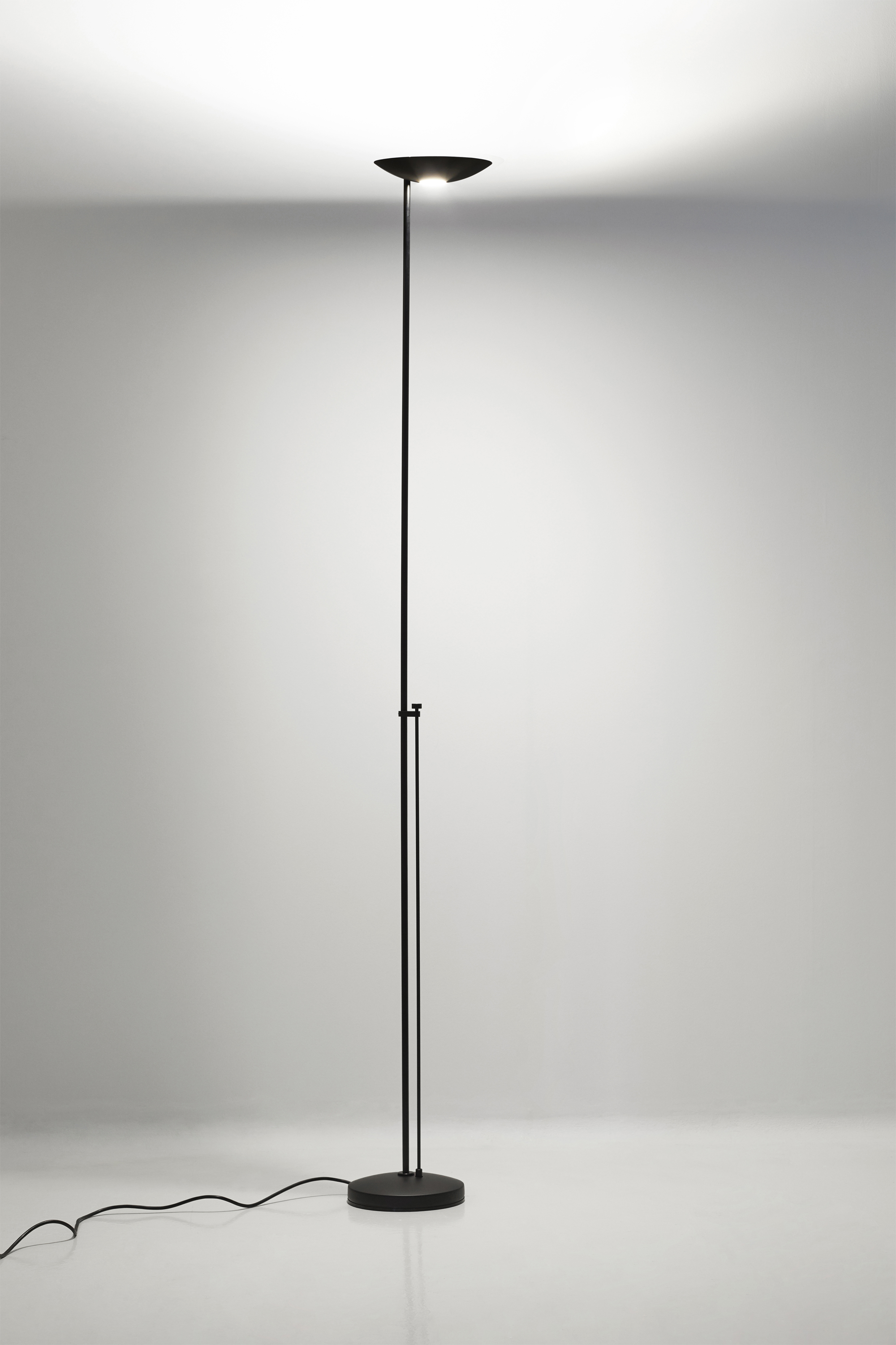 Торшер Icons Floor оснащён галогенной лампой с регулятором яркости. Она расположена на уровне сидящего человека, что обеспечивает удобство использования. Благодаря этой особенности торшер подходит для создания многоуровневого освещения. Вы можете регулировать интенсивность света в зависимости от настроения и потребностей. Прибор также совместим со светодиодными лампами, что даёт дополнительные возможности для настройки освещения.