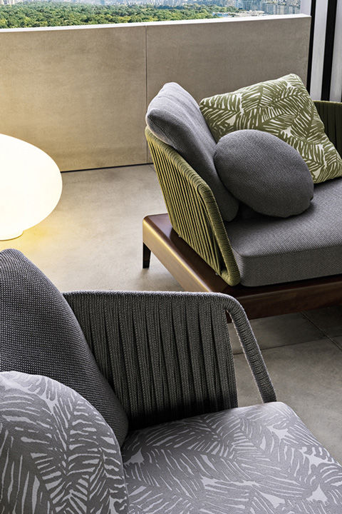 Коллекция Indiana от фабрики Minotti включает в себя уличную мебель. Основание дивана Indiana изготавливается из натуральной древесины. В качестве мягкого наполнителя используется пенополиуретан. Для обивки применяется ткань в различной цветовой гамме. Диван можно использовать на улице, благодаря использованию специальных влагостойких материалов.
