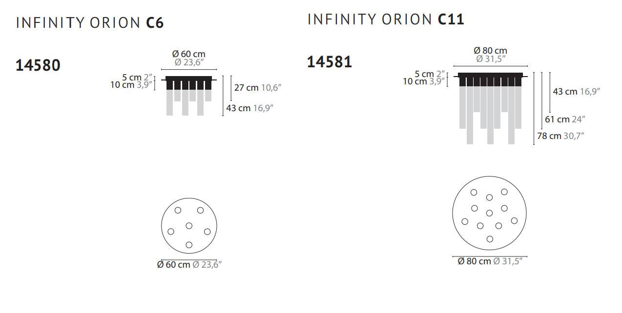 Светильники Infinity orion C в стандартной комплектации предлагаются с различными вариантами стекла. Можно выбрать короткое (35 см) или длинное (53 см) стекло, с кристаллами или без них. Это позволяет подобрать наиболее подходящий вариант. Он будет соответствовать индивидуальным предпочтениям и стилю помещения. Кроме того, предусмотрена возможность индивидуальной настройки светильника. Это позволяет создать уникальный экземпляр, идеально вписывающийся в интерьер.