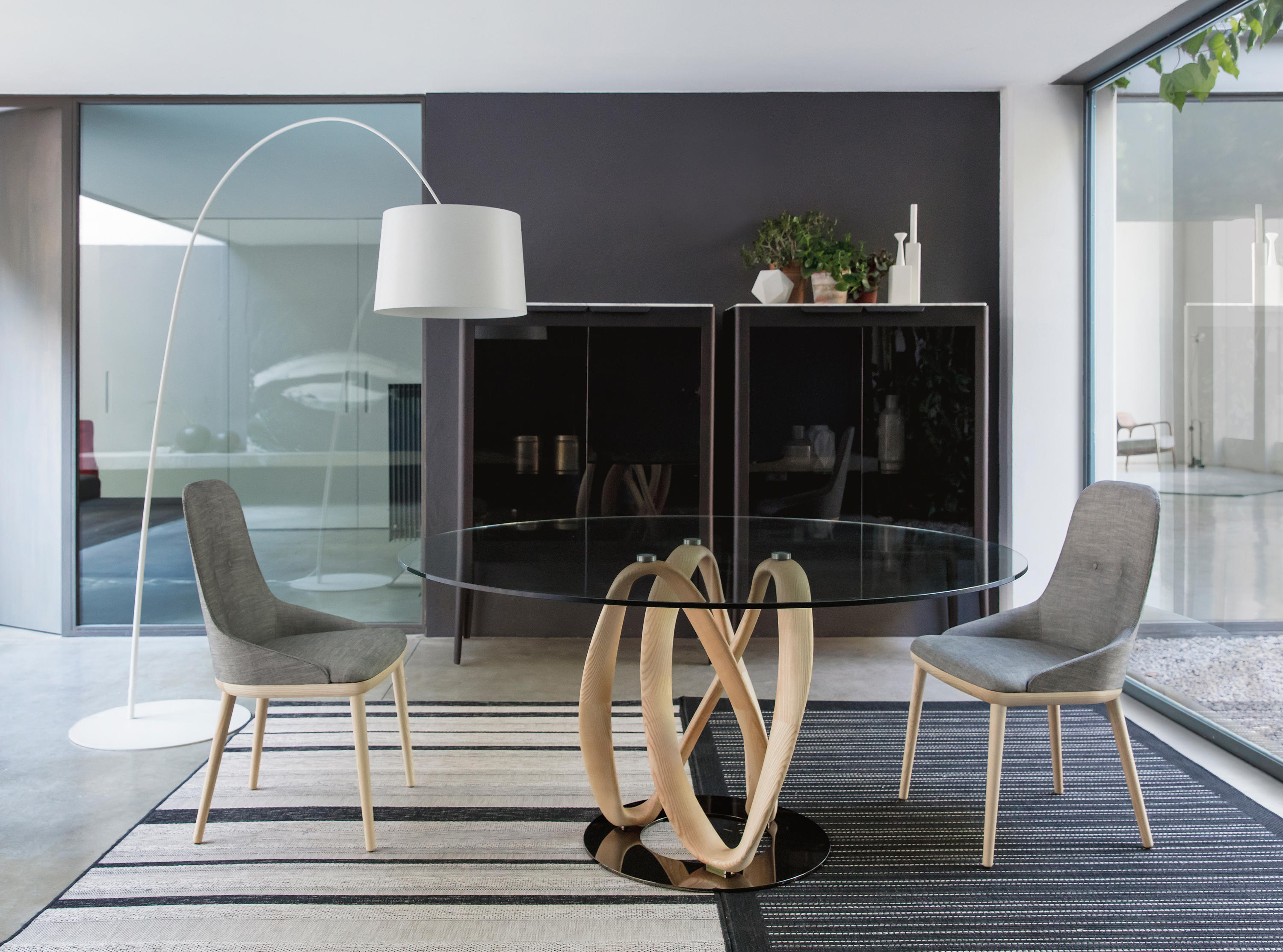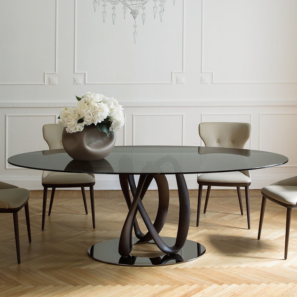 Обеденный стол Infinity tavolo оснащён центральной базой из массива выбранного дерева, установленной на металлической пластине. Столешница из закалённого стекла толщиной 12 мм.