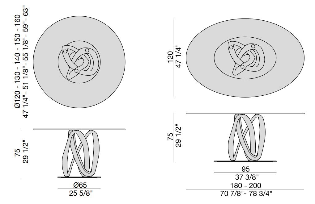Коллекция предлагает модели с одним центральным основанием для прямоугольных столов. Также есть модели с двумя основаниями для больших прямоугольных и овальных столов. Это позволяет адаптировать стол под размеры помещения и количество гостей. Металлическое кольцо поддерживает деревянное основание. Оно доступно в хромированном или чёрном хромированном исполнении для традиционного стиля. Также есть вариант в сером олове для современного образа.