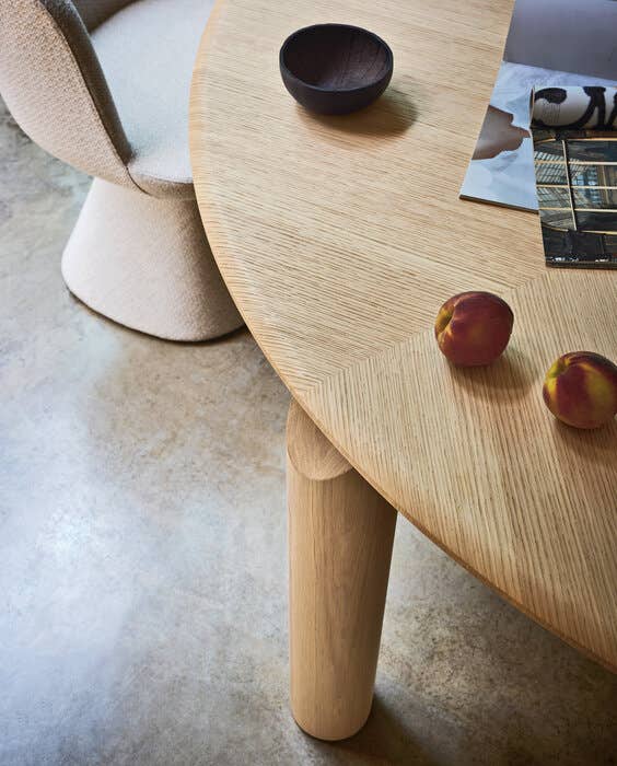 Мягкие округлые грани столешницы смягчают общее восприятие. Плавные изгибы верхней плоскости создают особую гармонию. Функциональный предмет превращается в скульптурный объект. Стол меняет характер в зависимости от ракурса. То он выглядит строгим и графичным. То неожиданно проявляет мягкие, обтекаемые формы.