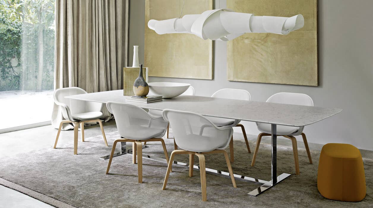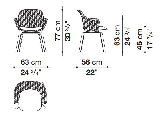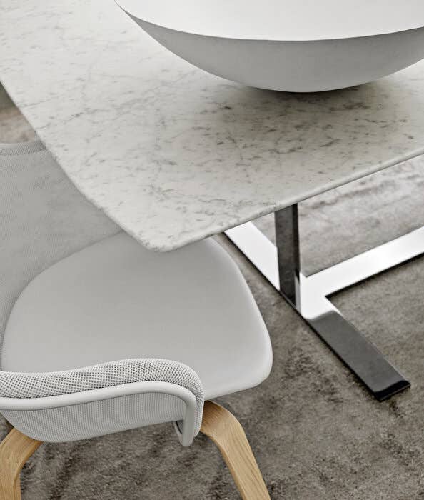 Четырёхспицевая деревянная опора мягко смягчает строгие линии стального каркаса, делая стул визуально более лёгким и утончённым. Это сочетание материалов создаёт ощущение баланса между прочностью и изяществом.