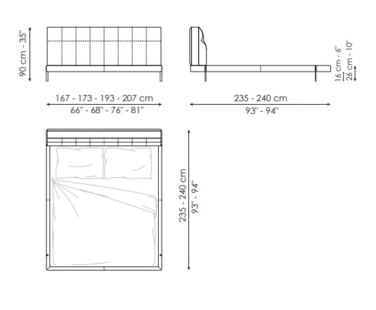 ширина 167-207 см, высота 90 см, длина 235-240 см