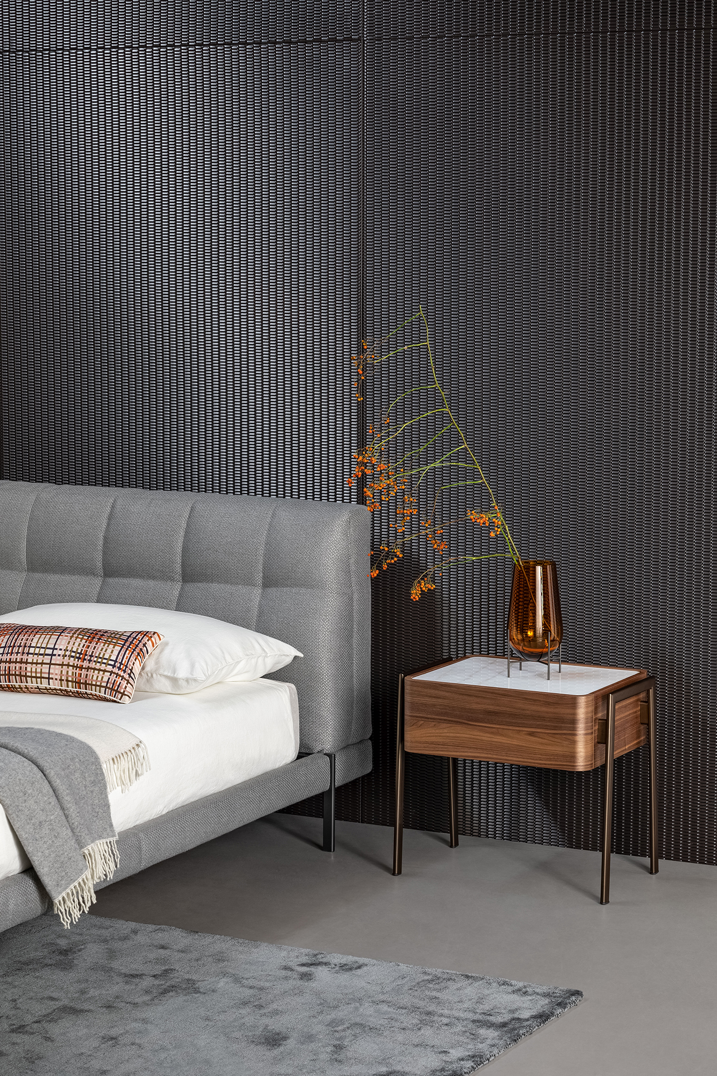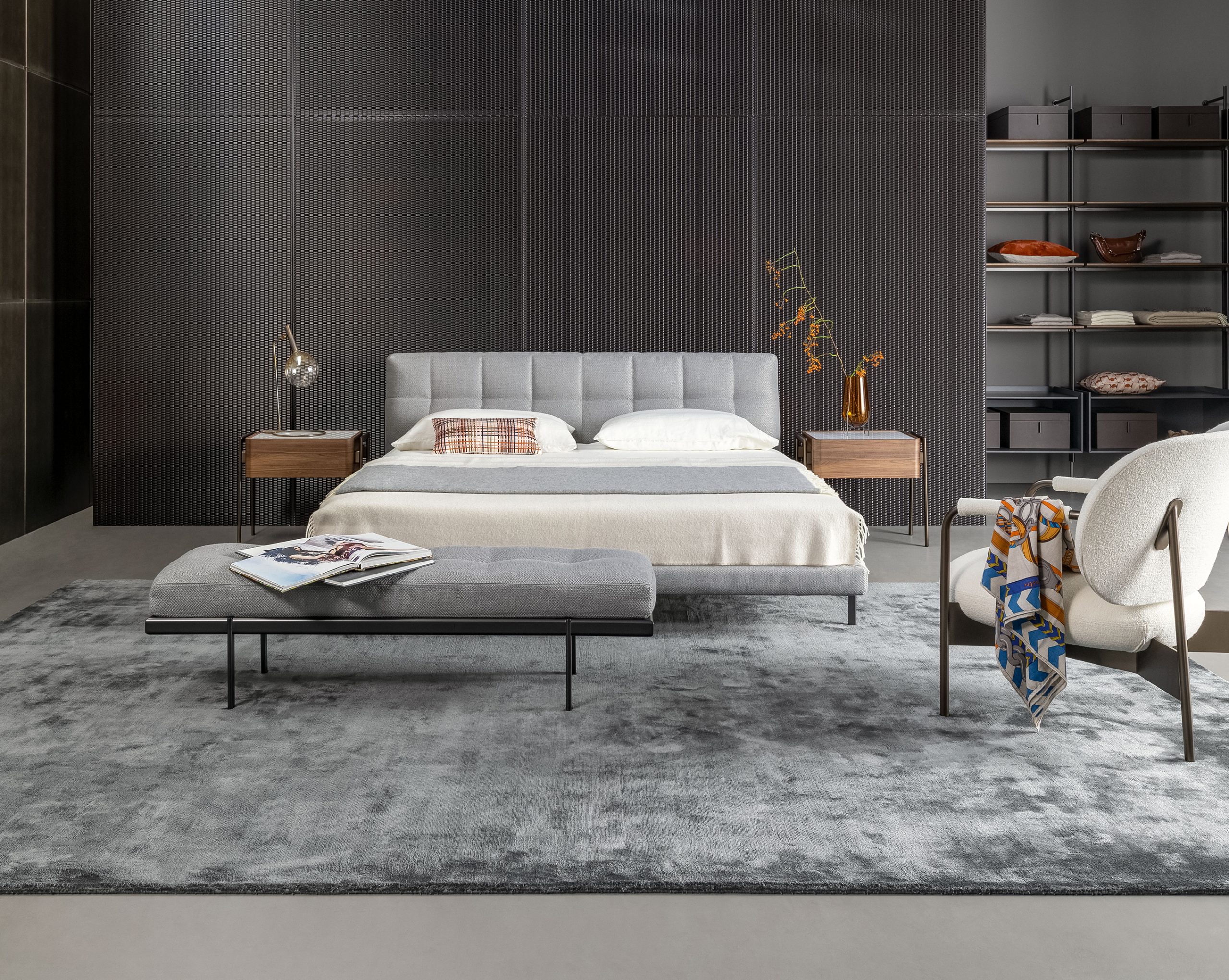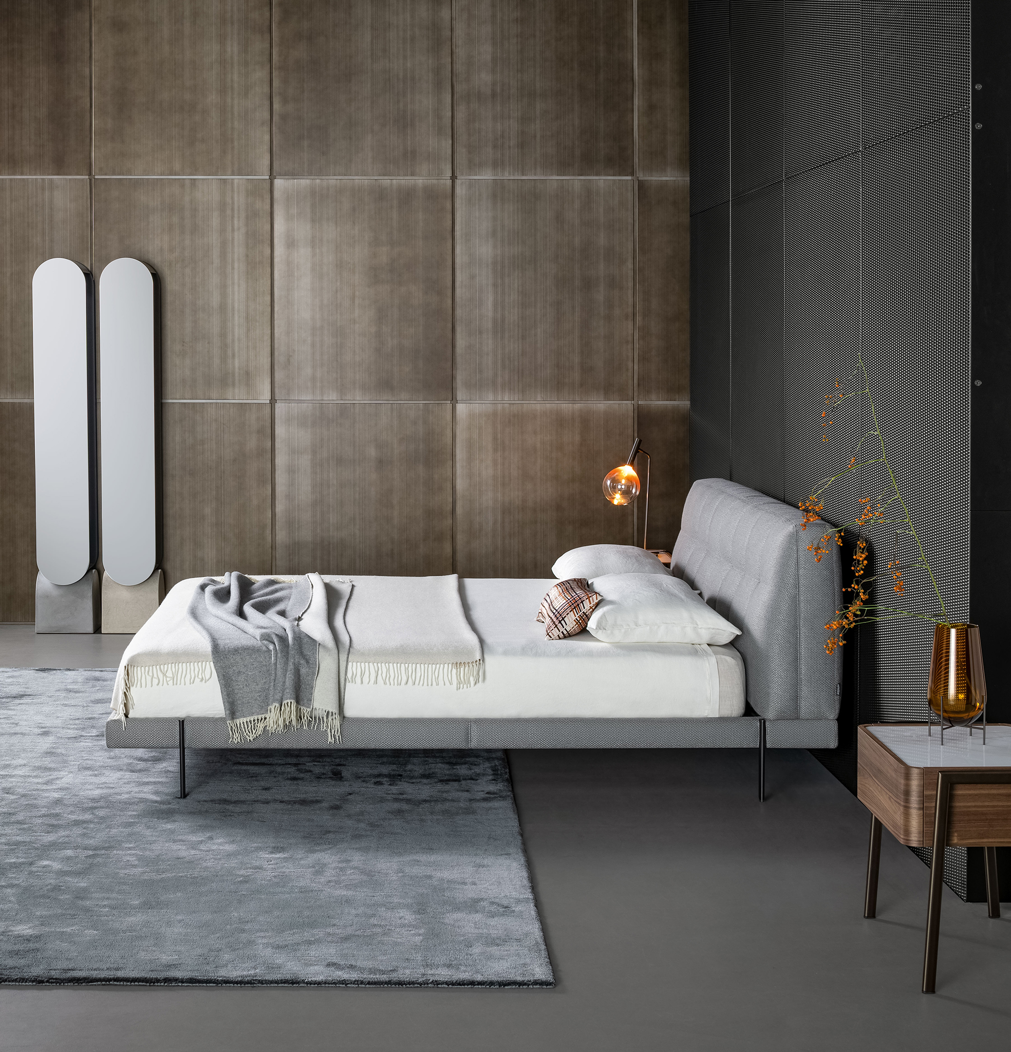 Кровать James — это воплощение утончённого дизайна, где каждый элемент продуман до мелочей. Легкость несущего основания контрастирует с объёмным, почти парящим в воздухе изголовьем, создающим эффект воздушности и одновременно — ощущение защищённости и уюта.