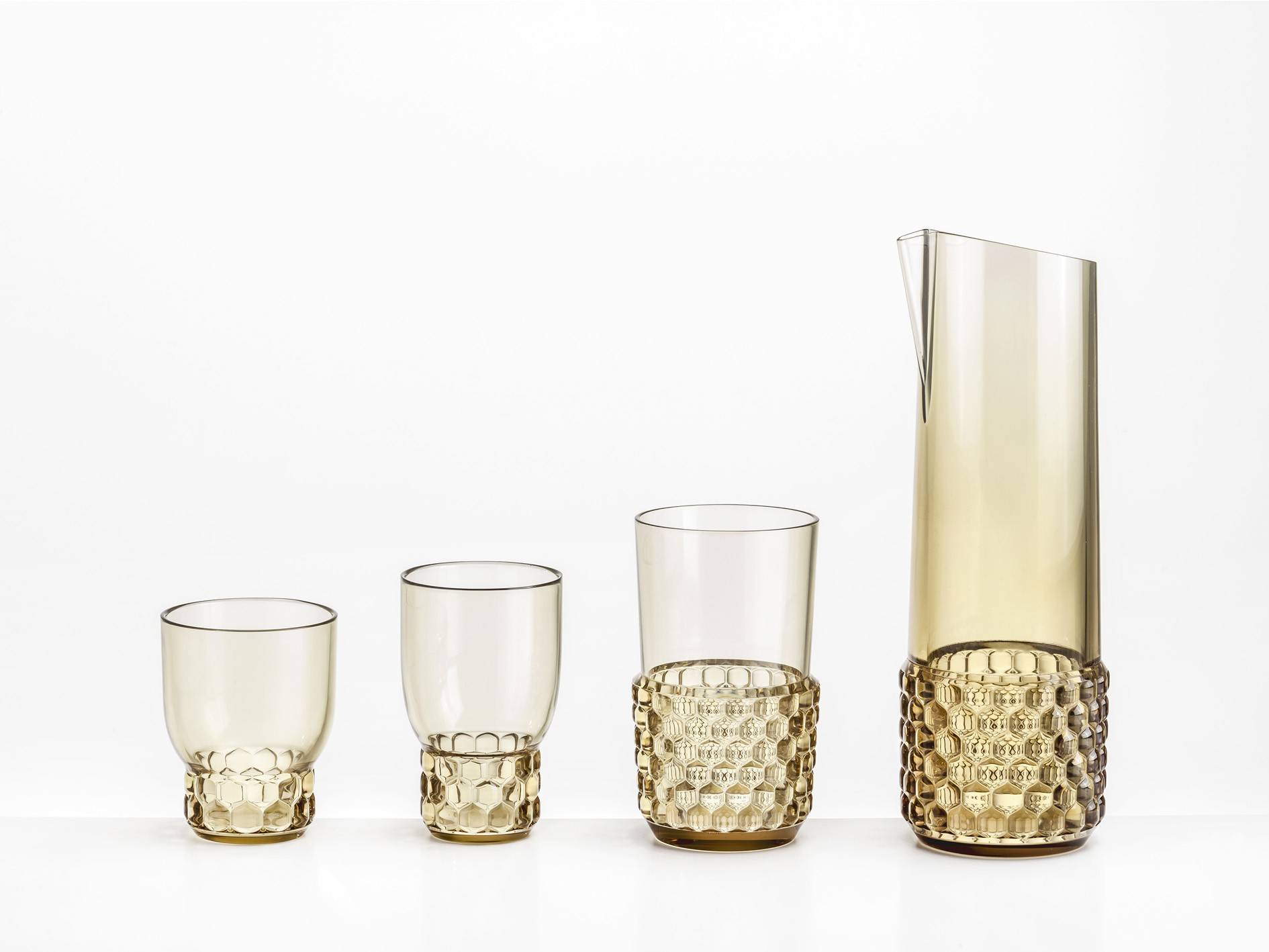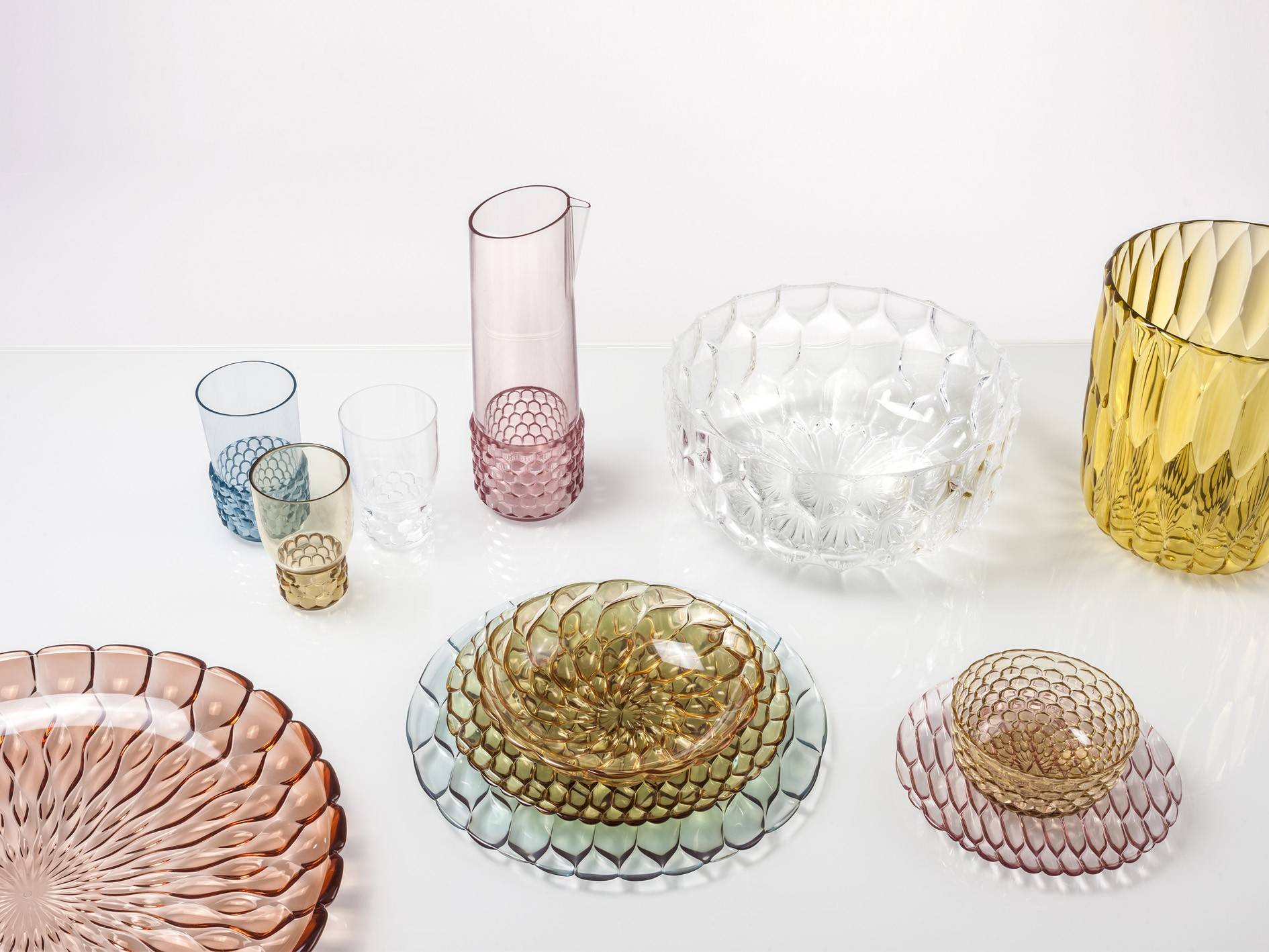 Коллекция посуды Jellies Family включает в себя стаканы, тарелки, салатницы, графины. В 2018 году семейство пополнилось кофейным набором и сахарницей. Стакан изготавливается из технополимера в четырех вариантах цвета: зеленый, прозрачный, голубой или розовый. Подробнее о данной модели уточняйте у менеджеров или в PDF инструкции.nn