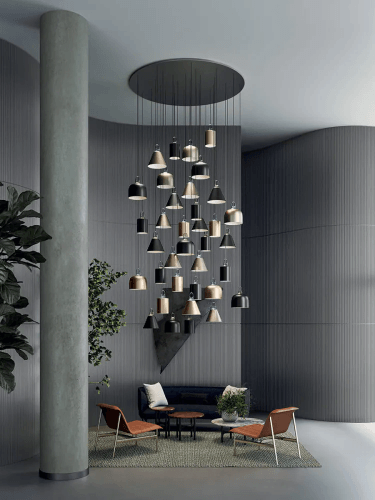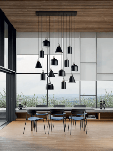 JIM имеет продуманную конструкцию с системой подвесных ламп оригинальной формы. Это делает светильник универсальным. Он легко адаптируется к различным стилям интерьера. Это могут быть современный минимализм, классический дизайн или эклектика. Геометрия и лаконичность форм JIM делают его не только функциональным, но и стильным декоративным элементом.