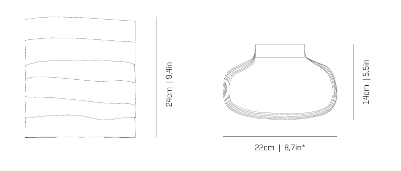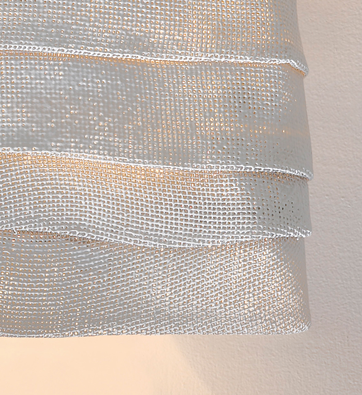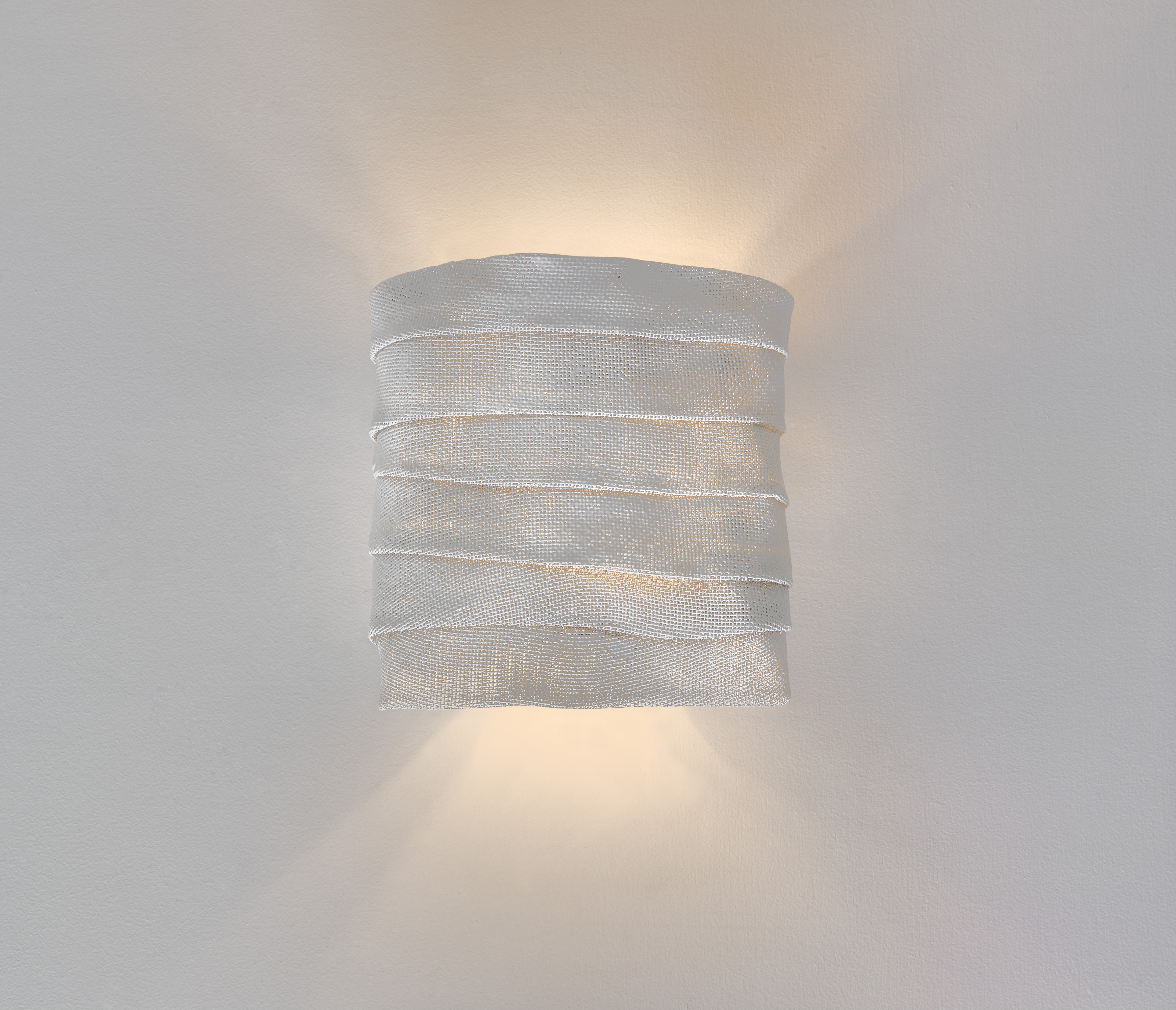 Горизонтальные полосы, созданные мягкими изгибами материала, подчеркивают игру светотени, создавая эффект рассеянного освещения. Светильник преломляет лучи таким образом, что создает мягкое отражение на стене, формируя приятную атмосферу вокруг себя.