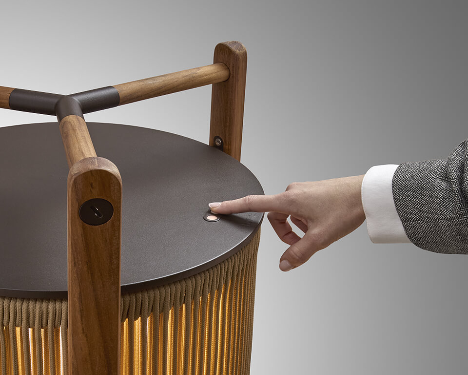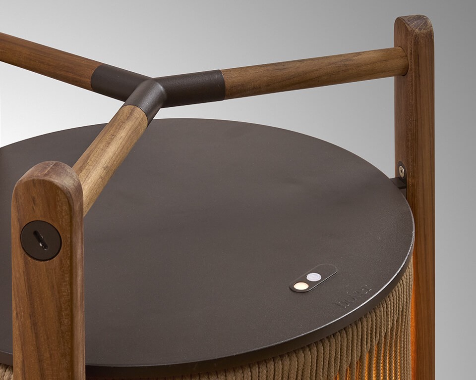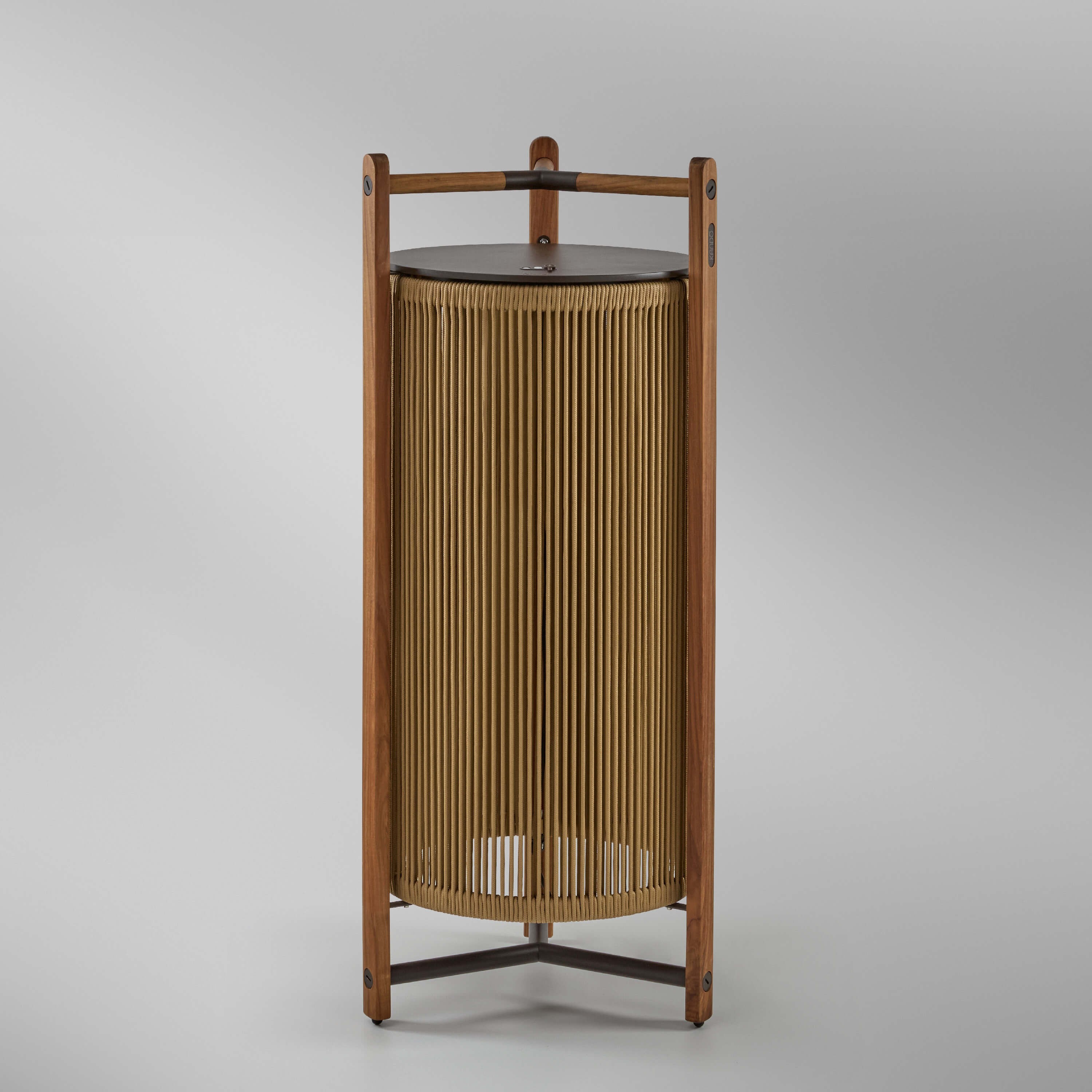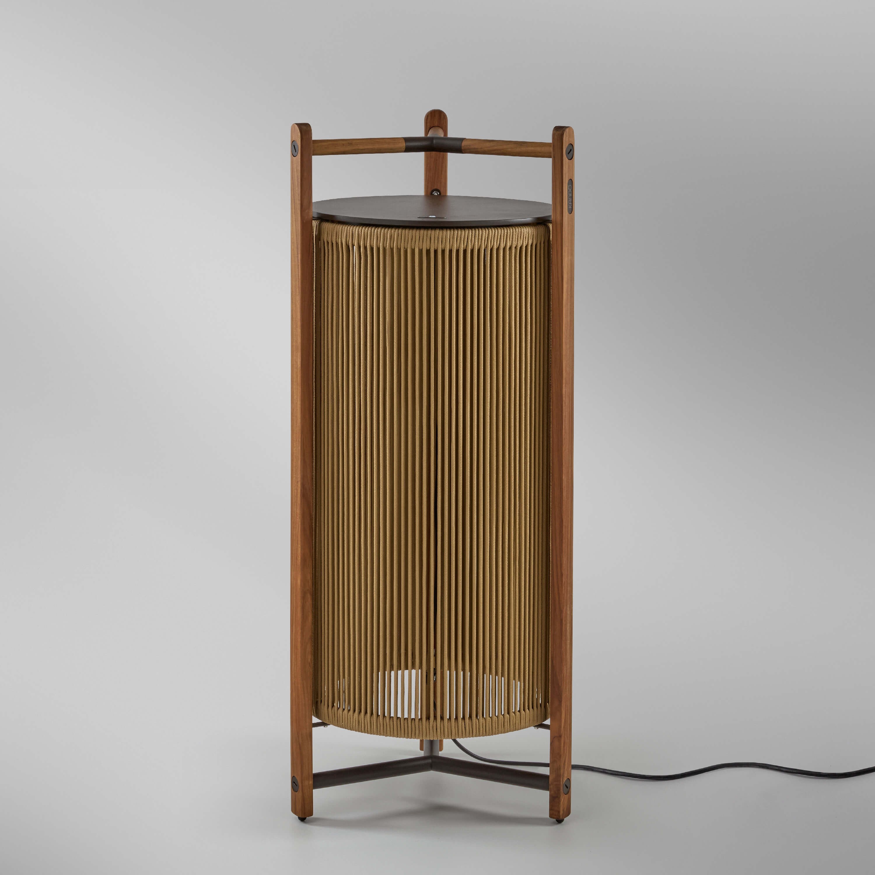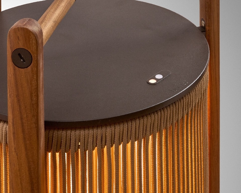 Каждая деталь здесь продумана до мелочей. Абажур, сплетённый из мягкой льняной ленты для интерьеров или прочного морского каната для улицы, рассеивает тёплый, обволакивающий свет, превращая обычное освещение в игру теней и мягких бликов. Лёгкий, но прочный каркас из тикового дерева добавляет природной эстетики, а изящно изогнутая ручка делает лампу мобильной — её можно легко перенести в беседку, на террасу или поставить у кресла, меняя настроение пространства в одно движение.