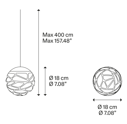Kelly Cluster – это компактный металлический шар диаметром 18 см, внутри которого находится диффузор из глянцевого полупрозрачного стекла молочно-белого цвета. Равномерно распространяемый через прорези свет подчеркивает изысканность лазерной обработки. Кажется, что светильник, подвешенный на тонком питающем кабеле длиной до 4 метров, плывет в пространстве, распространяя теплый свет, излучаемый лампой LED мощностью 7 Вт. Индекс цветопередачи (CRI) 90 с точностью передает естественный цвет предметов.