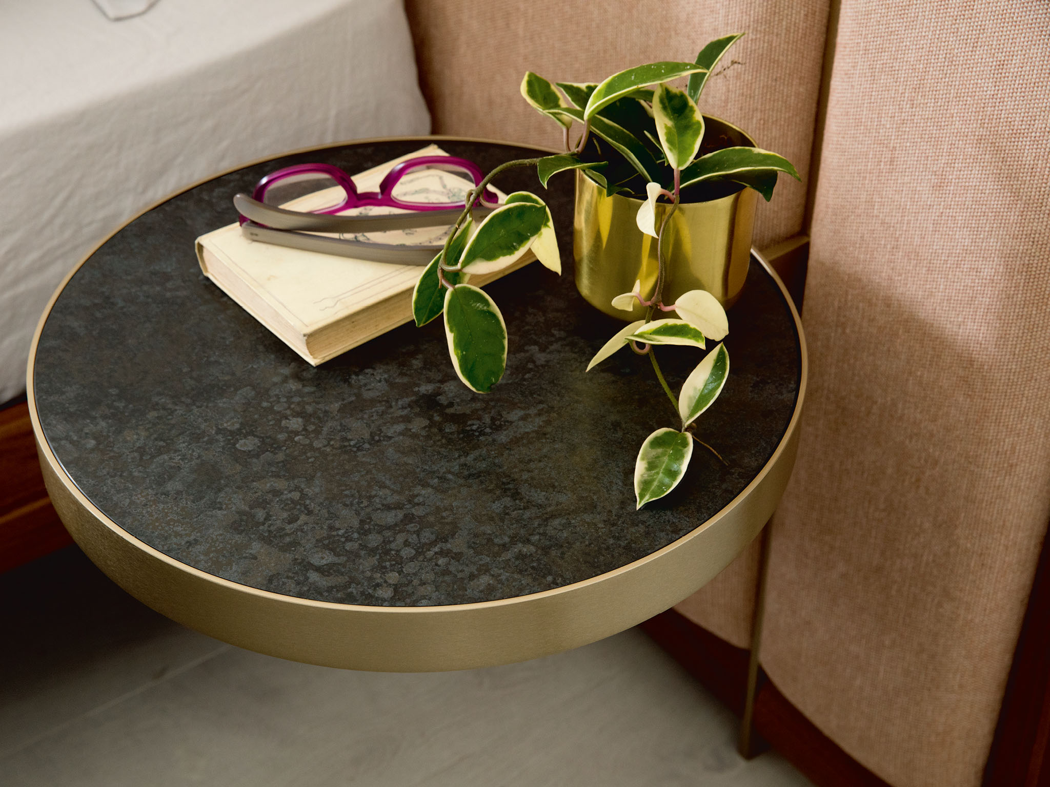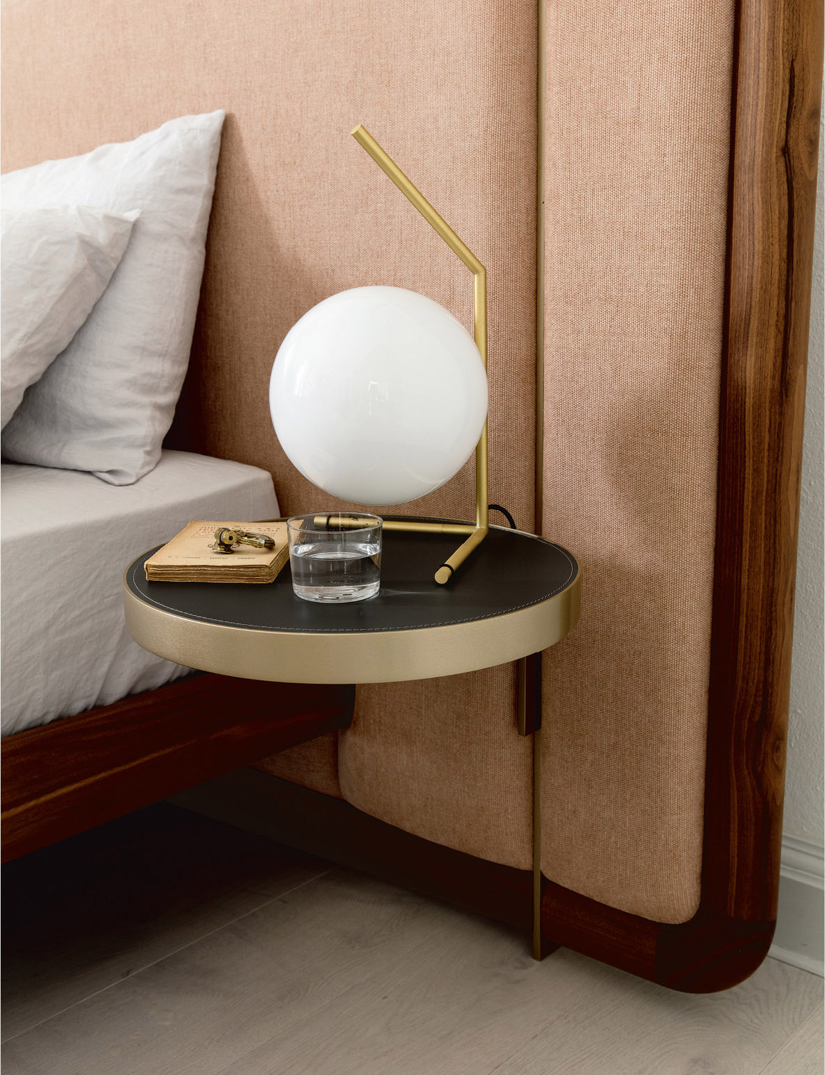 Подвесные прикроватные тумбочки выполненные в едином стиле с кроватью и из тех же материалов, дополняют композицию, создавая гармоничный образ. Латунные профили на столешницах добавляют яркости, делая спальню стильной. Эти элементы также делают спальню функциональной.