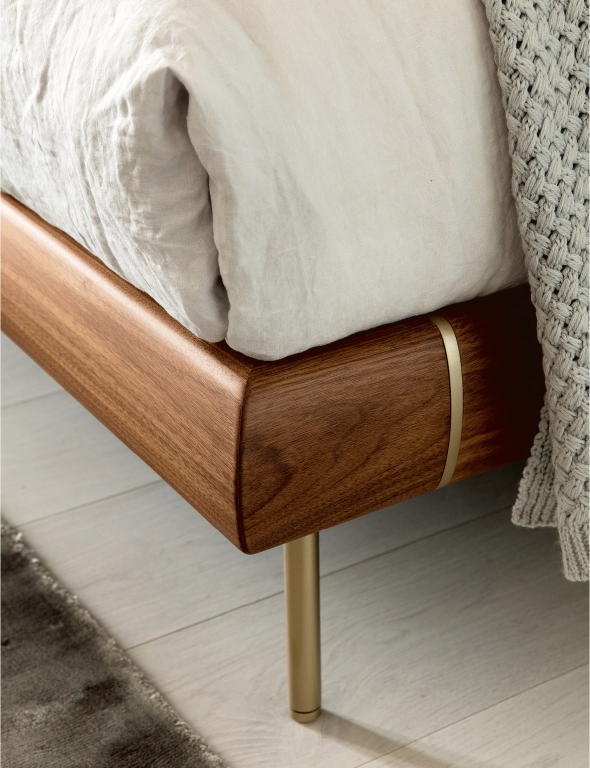 Ножки кровати, изготовленные из матовой латуни, напоминают стиль пятидесятых годов. Они не только выполняют функциональную роль, приподнимая кровать над полом, но и служат декоративным элементом, подчёркивающим её изящество и утончённость. Матовая поверхность латуни придаёт кровати благородный и спокойный вид, гармонично вписывая её в любой интерьер.