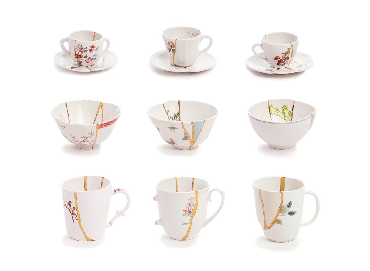 Коллекция Kintsugi включает в себя различные тарелки, стаканы, чашки, кружки. Кружка выполняется из фарфора, кусочки склеиваются между собой драгоценным 24-каратным золотом. Каждая модель уникальна. Подробности уточняйте у менеджеров или в PDF инструкции.