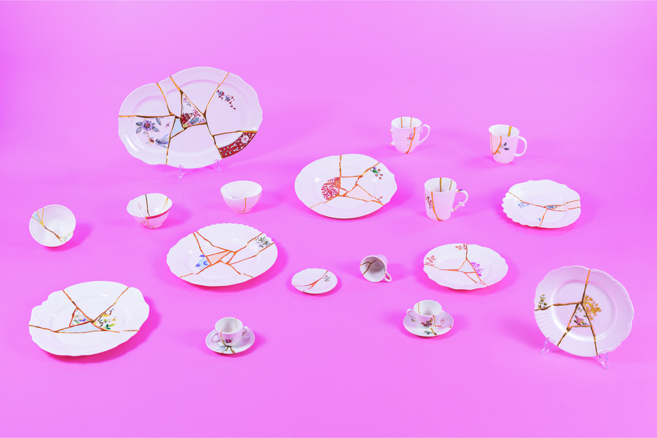 Коллекция Kintsugi включает в себя различные тарелки, стаканы, чашки, кружки. Кофейная чашка с блюдцем выполняется из фарфора, кусочки склеиваются между собой драгоценным 24-каратным золотом. Каждая модель уникальна. Подробности уточняйте у менеджеров или в PDF инструкции.