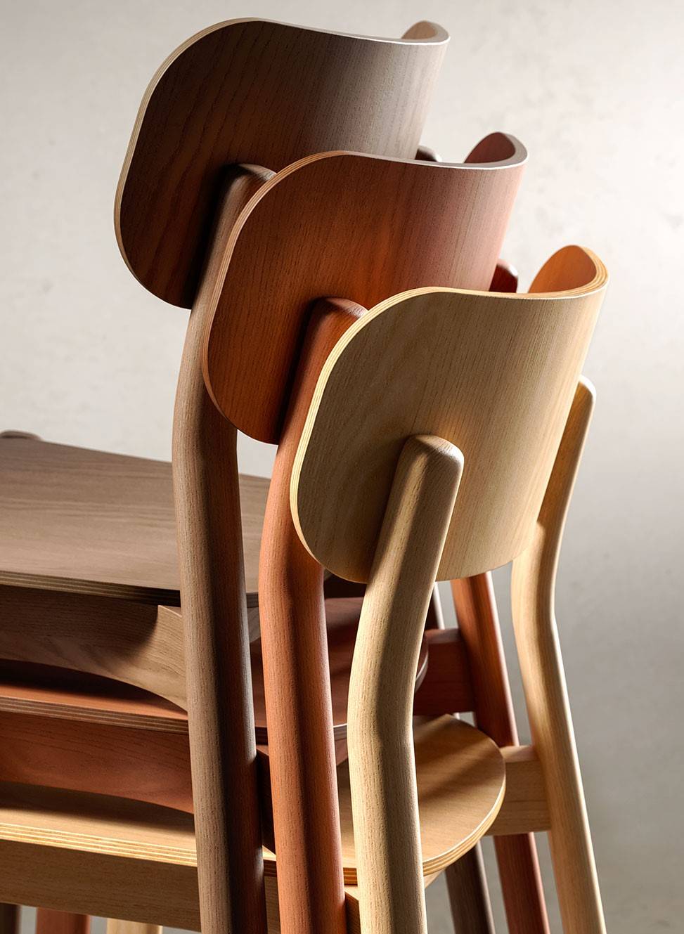 Kiyumi Wood представлена в двух вариантах: модель с мягким сиденьем и спинкой и модель, где сиденье и спинка выполнены из гнутой фанеры. Обе версии имеют прочный каркас из массива ясеня.
