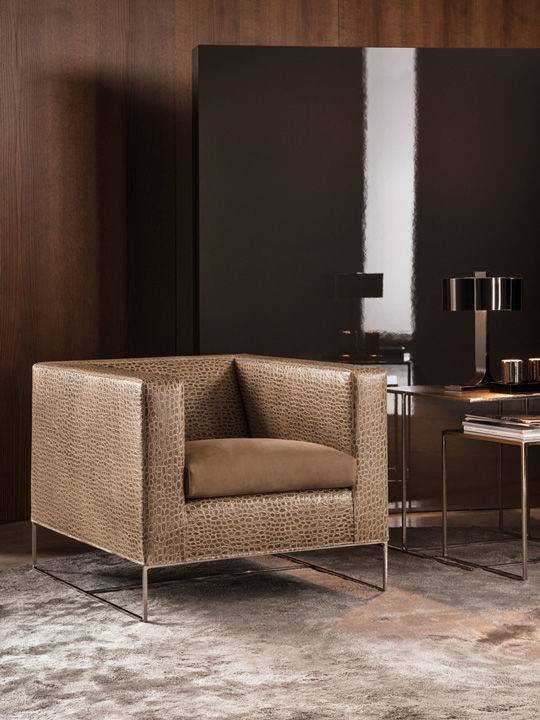 Основание кресла Klee изготовлено из качественного прочного металла. Спинка, сиденье и подлокотники наполнены полиуретаном с прослойкой гусиного пуха. Кресло доступно в обивке из ткани или кожи различных цветов и состава. Подробности уточняйте у менеджеров.