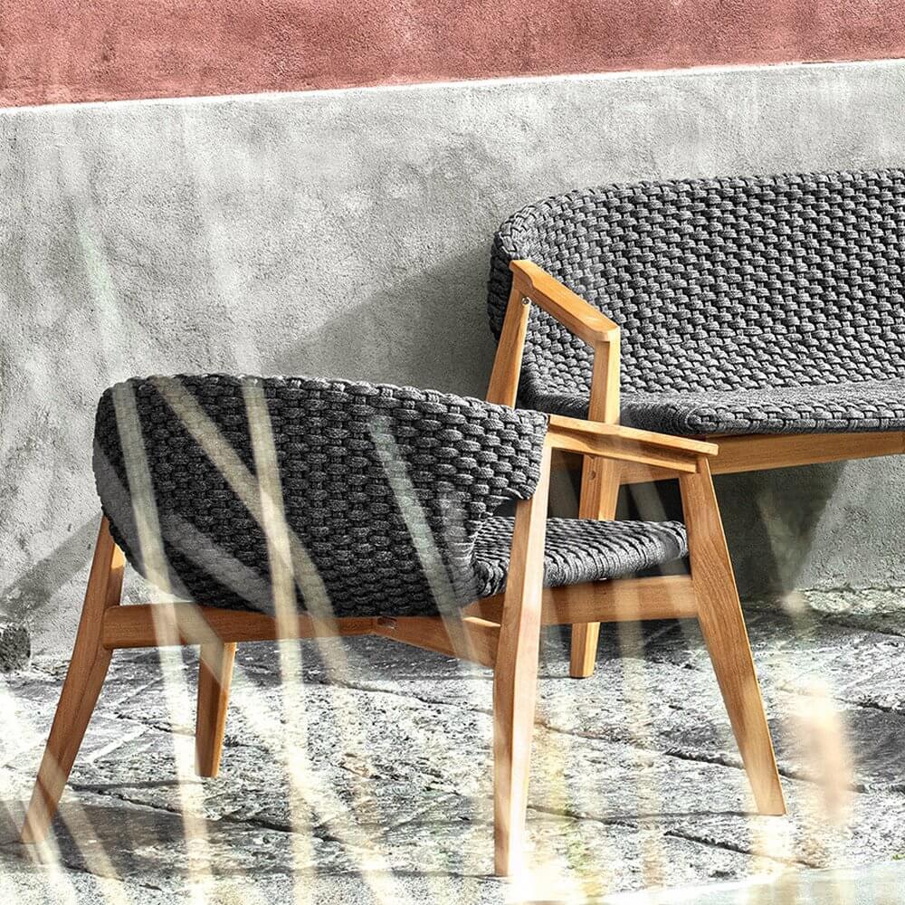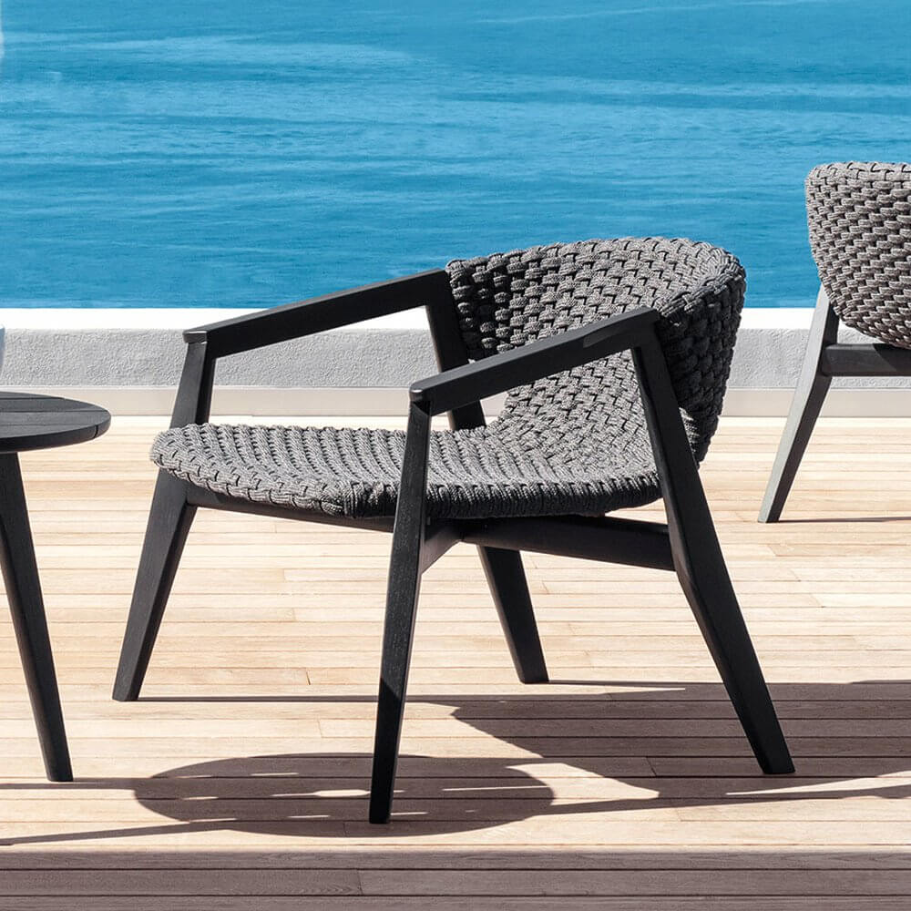 Knit — удобное кресло от фабрики Ethimo. Основание модели изготавливается из натурального тика или красного дерева, окрашенного в черный цвет. Сиденье и спинку производят из синтетических волокон Comfortable Flat Rope с водоотталкивающей пропиткой и имитацией вязанного полотна, что добавляет уюта в интерьере. В коллекцию Knit также входит несколько видов столов, стульев, шезлонг и диван. Дополнительно можно приобрести чехол от дождя. Более подробную информацию и доступные расцветки можно уточнить у менеджера.