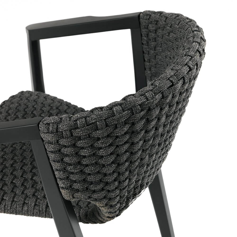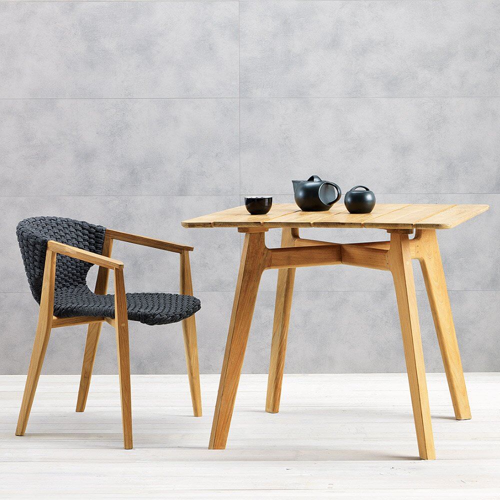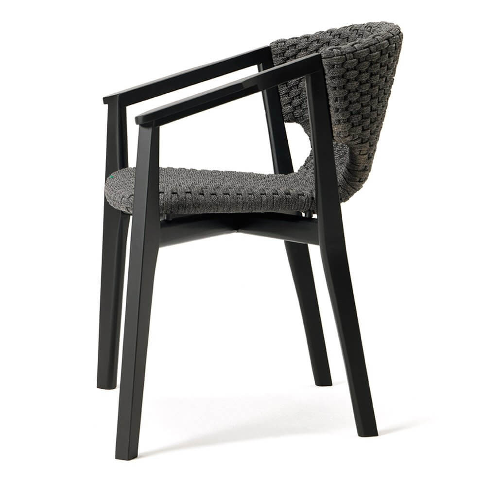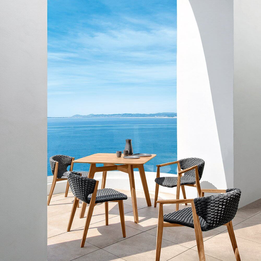 Knit — удобный стул от фабрики Ethimo. Основание модели изготавливается из натурального тика или красного дерева, окрашенного в черный цвет. Спинка и сиденье производят из синтетических волокон Comfortable Flat Rope с водоотталкивающей пропиткой и имитацией вязанного полотна, что добавляет уюта в интерьере. Стул изготавливается с подлокотниками и без них. В коллекцию Knit также входит несколько видов столов, кресел, шезлонг и диван. Дополнительно можно приобрести чехол от дождя. Более подробную информацию и доступные расцветки можно уточнить у менеджера.