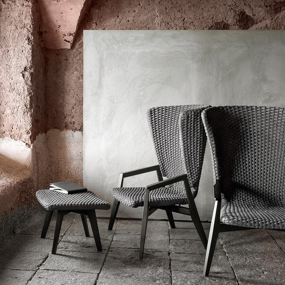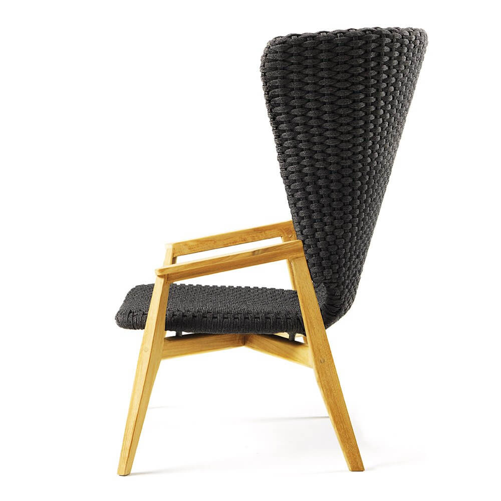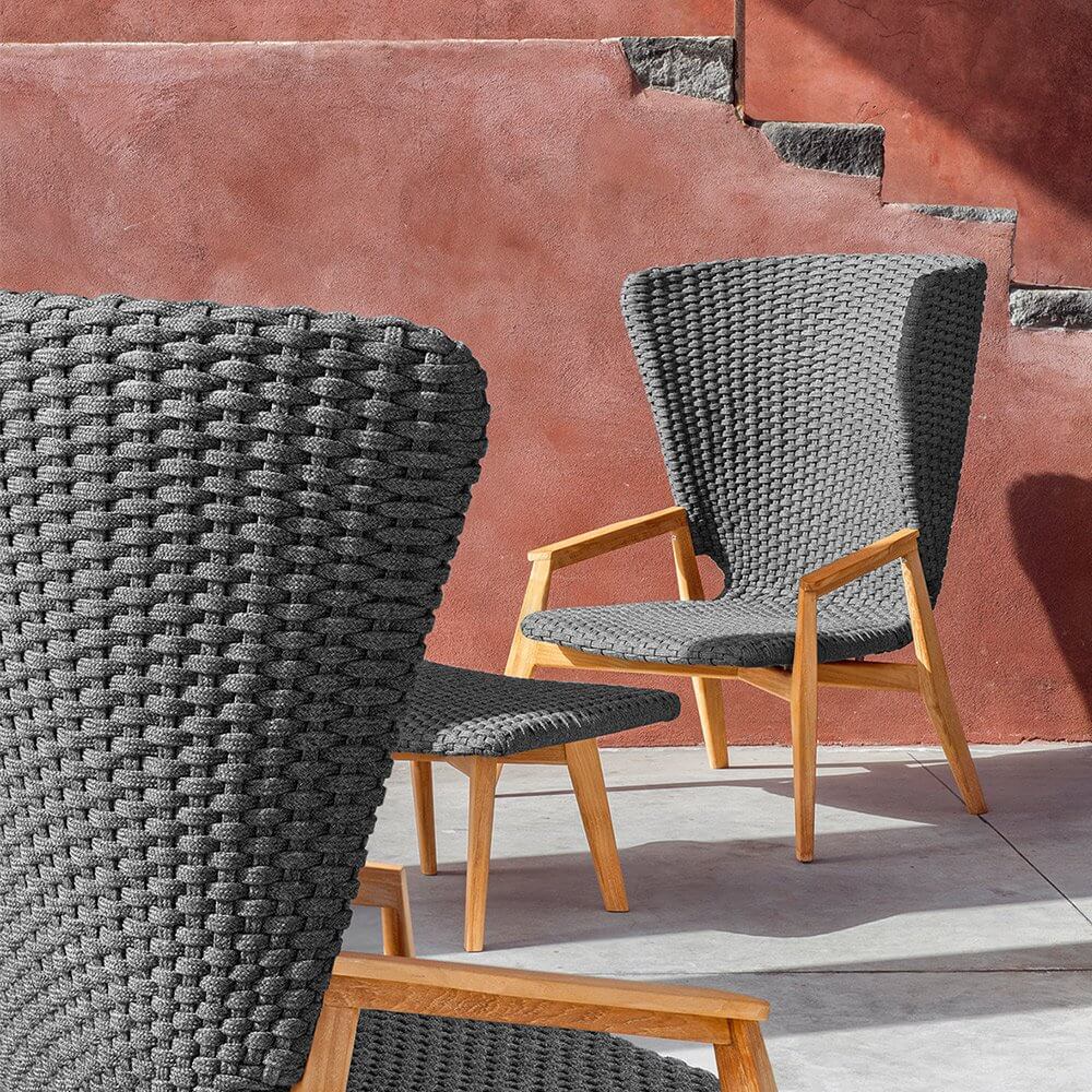 Knit — удобное кресло с высокой спинкой от фабрики Ethimo. Основание модели изготавливается из натурального тика или красного дерева, окрашенного в черный цвет. Сиденье и спинку производят из синтетических волокон Comfortable Flat Rope с водоотталкивающей пропиткой и имитацией вязанного полотна, что добавляет уюта в интерьере. В коллекцию Knit также входит несколько видов столов, стульев, шезлонг и диван. Дополнительно можно приобрести чехол от дождя. Более подробную информацию и доступные расцветки можно уточнить у менеджера.