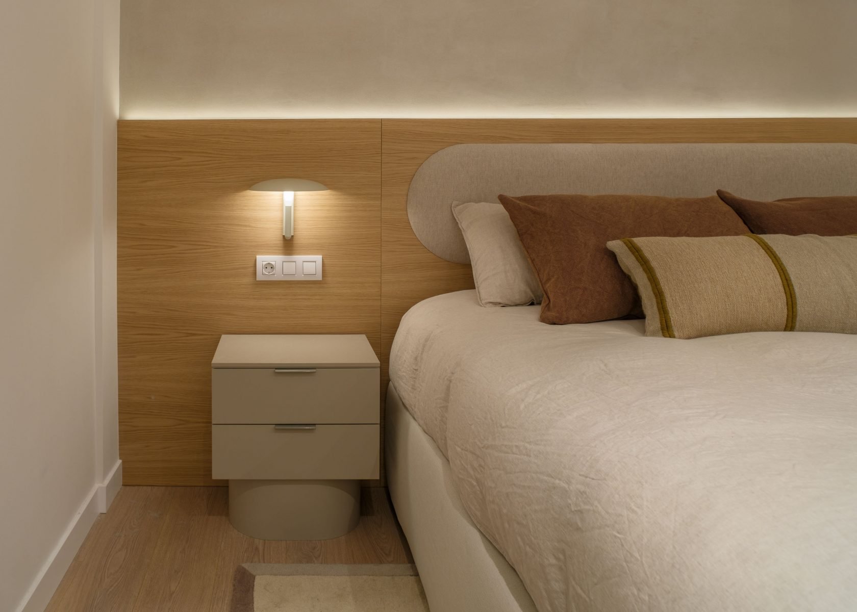 Одной из ключевых особенностей светильника Konoha является возможность вращения плафона на 360 градусов. Это позволяет легко и точно направлять свет в нужную сторону, адаптируя его под конкретные задачи. Например, если прожектор направлен вверх, свет мягко отражается от стен, придавая помещению тёплый и уютный оттенок. Этот эффект идеально подходит для создания комфортной обстановки в спальнях, гостиных или залах ожидания.