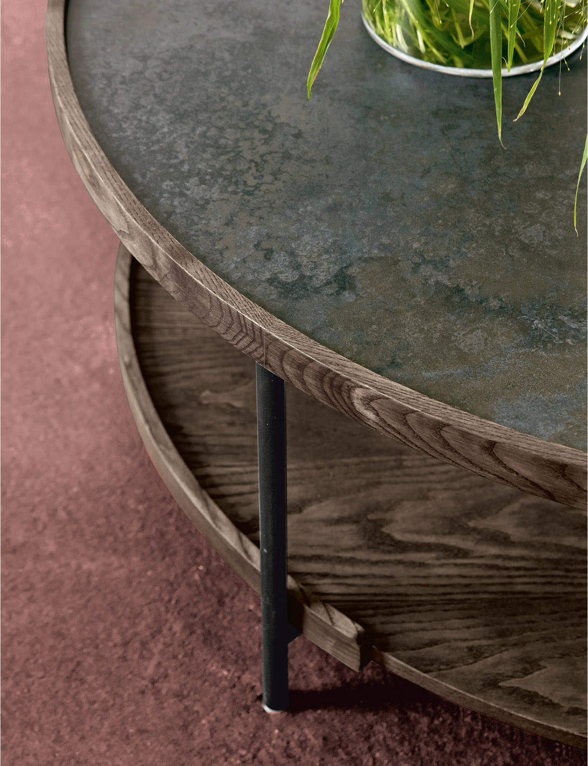 Столешницы выполнены из ясеня, добытого в экологически чистых лесах компании Porada. Этот выбор материала подчёркивает приверженность бренда к устойчивому развитию и заботе об окружающей среде. Текстура ясеня, обработанная по технологии Rock, придаёт поверхности столешницы изящную игру контрастов. Это добавляет изделиям глубину и шарм.