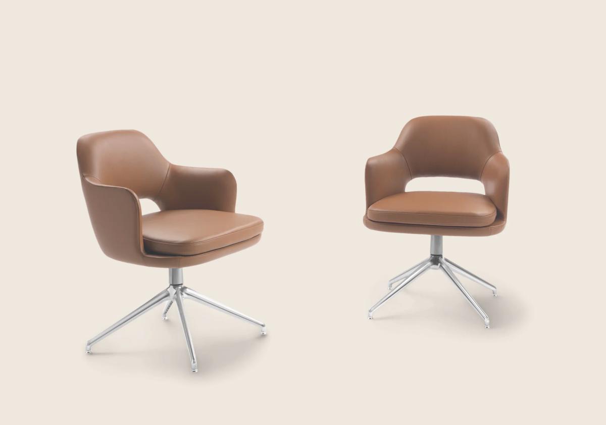 Коллекция ELISEO включает в себя различные модели – от компактных обеденных стульев до просторных кресел и бержеров. Независимо от размера, каждая модель сохраняет идеальные пропорции, подчеркивая баланс между формой и функциональностью. Особое внимание заслуживает вариативность опор: можно выбрать классическую деревянную ножку с различными вариантами отделки. Или современную литую алюминиевую основу с поворотным механизмом, которая добавляет динамики и удобства в использовании.