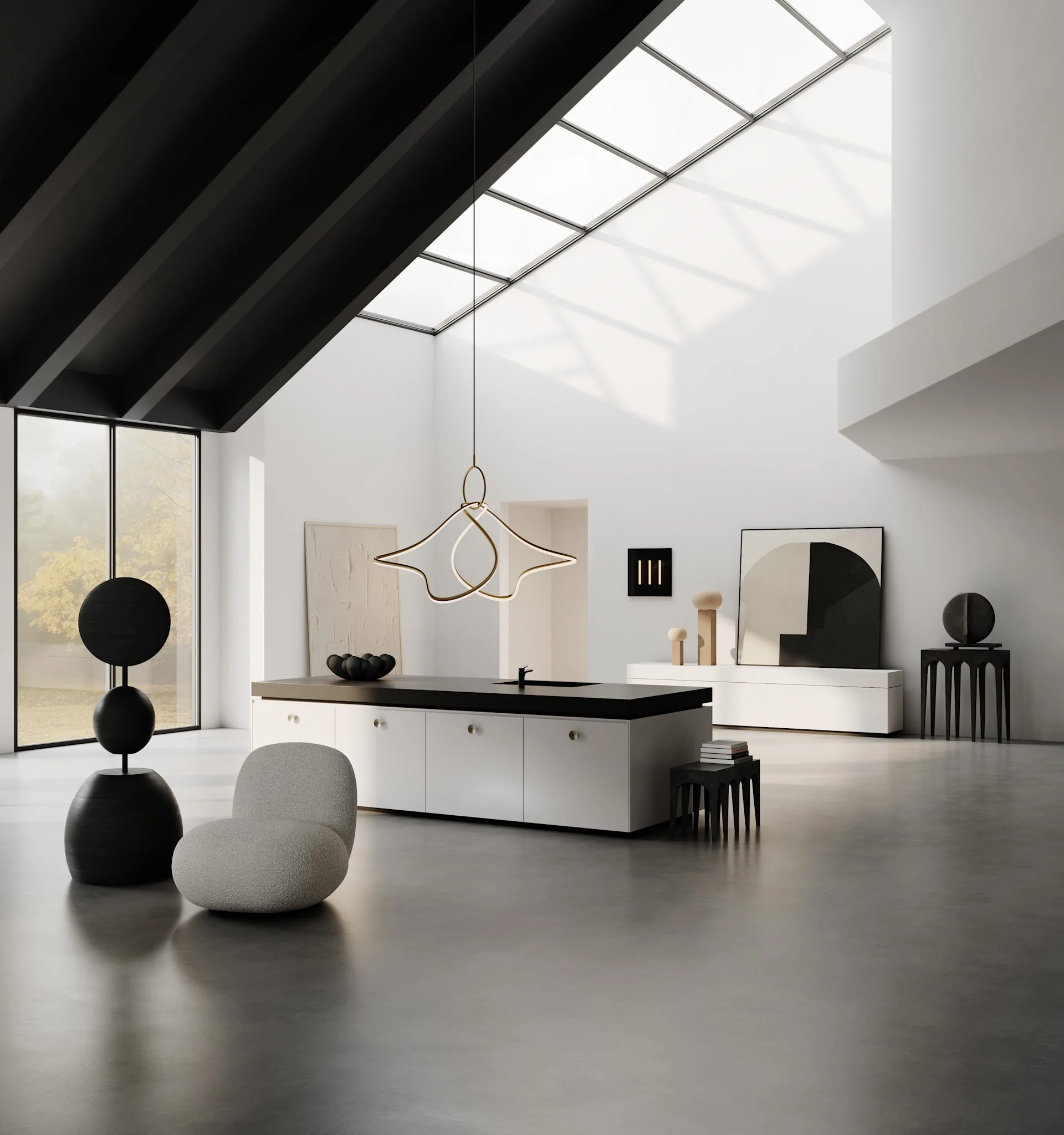 Светильник Kumo Chandelier воплощает в себе элегантность и новаторство, соединяя японскую поэтику облаков с современным дизайном. Его название, Kumo, что в переводе означает «облака», отражает воздушность и плавность форм, будто парящих в пространстве. Изготовленный из металлических труб с латунным покрытием и дополненный акриловыми вставками, этот светильник излучает мягкий теплый свет, создающий уютную атмосферу.