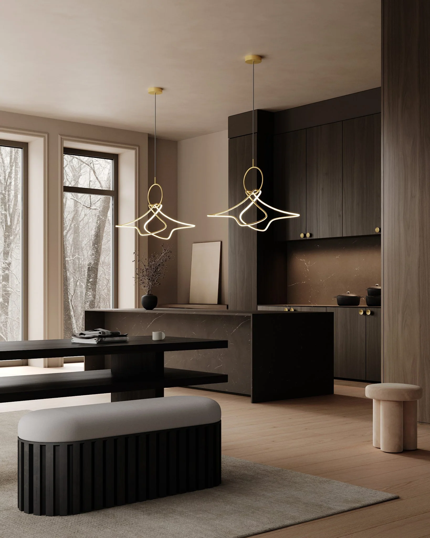 Особенностью люстры является ручная сборка, благодаря которой свет распределяется неравномерно. Это создаёт интересные световые акценты вдоль изогнутых линий, придавая пространству уникальный и атмосферный вид.