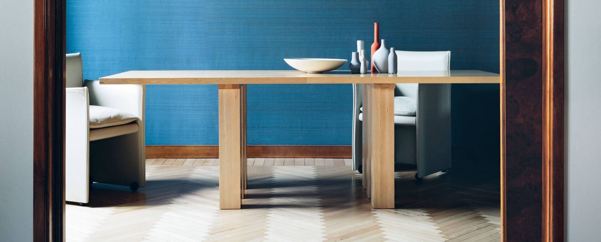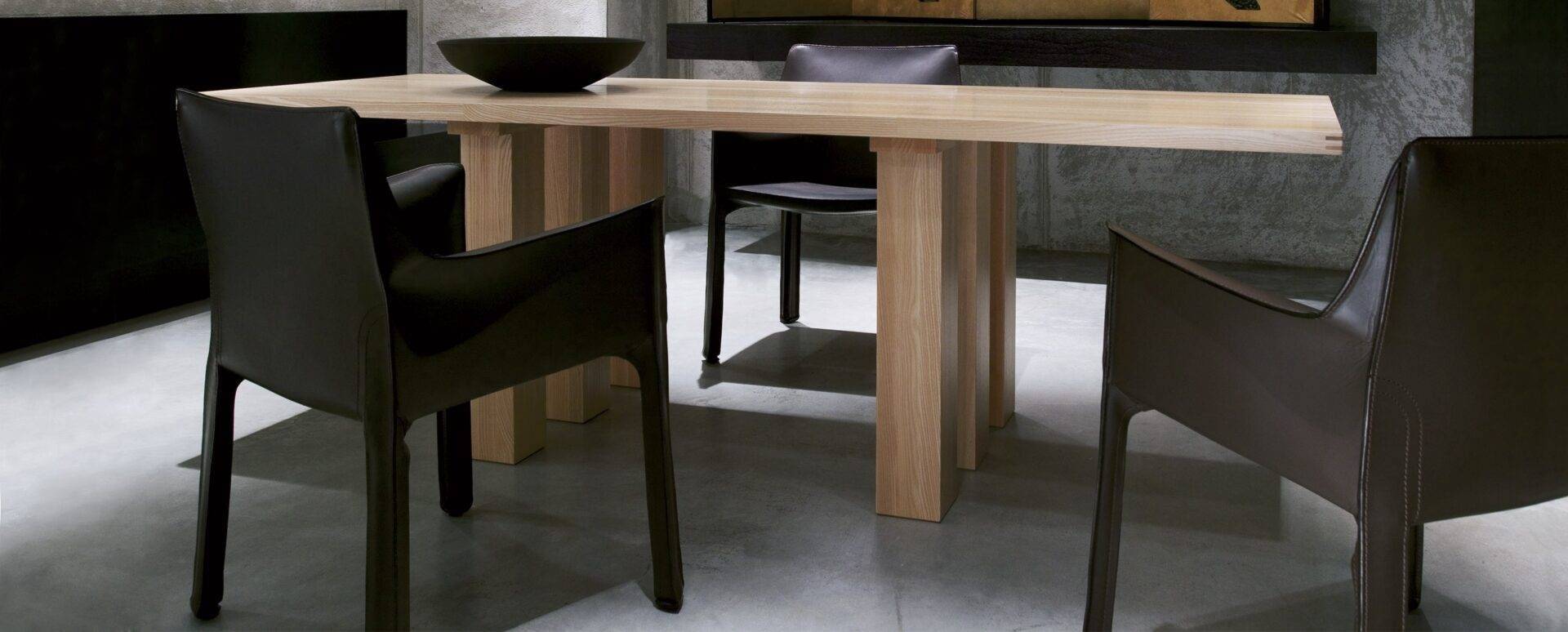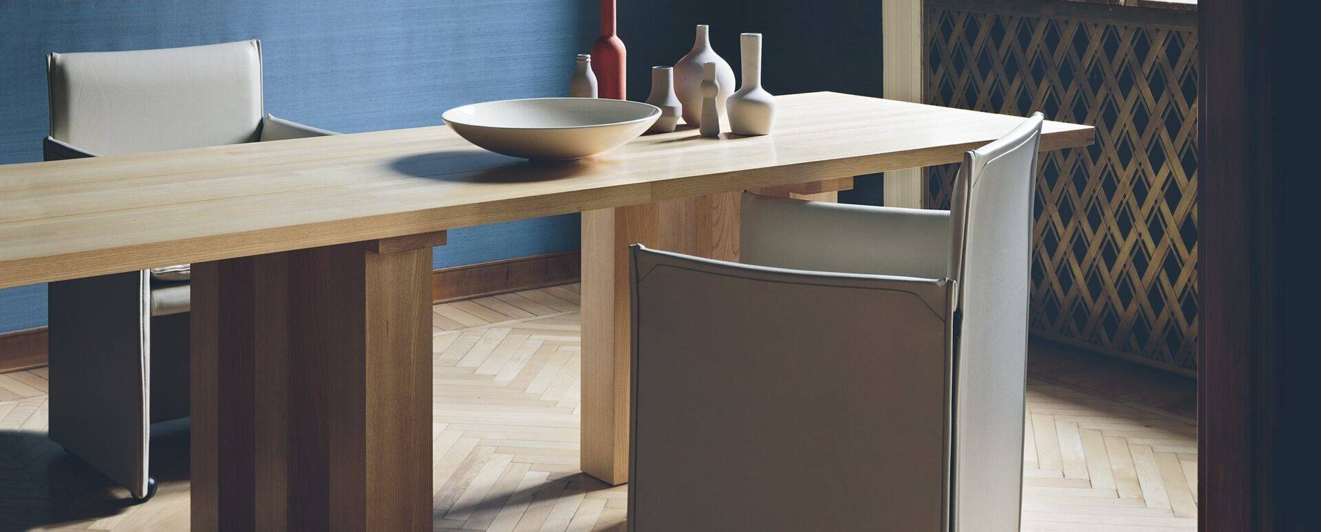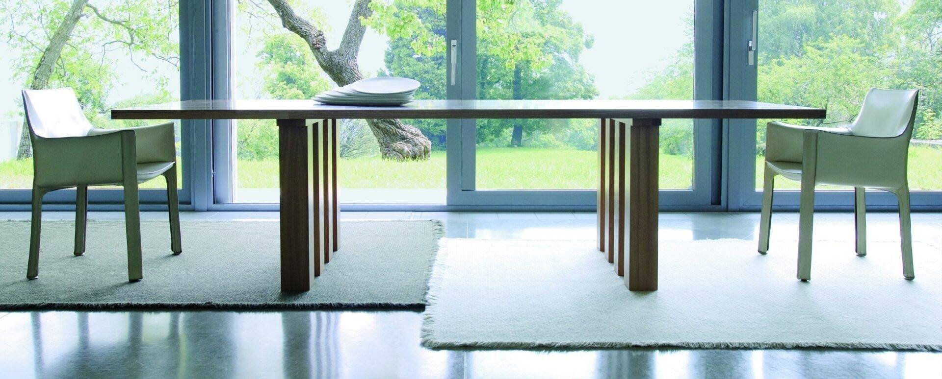 Прямоугольный обеденный стол La Basilica разработан знаменитым дизайнером Марио Беллини (Mario Bellini) специально для фабрики Cassina. Возможно два варианта исполнения: столешница из трех перекладин на основании из шести ножек и столешница из четырех перекладин на основании из восьми ножек. Деревянные перекладины столешницы и ножек имеют одинаковую ширину. Более подробную информацию можно уточнить у менеджера.