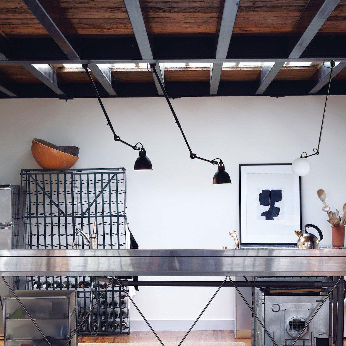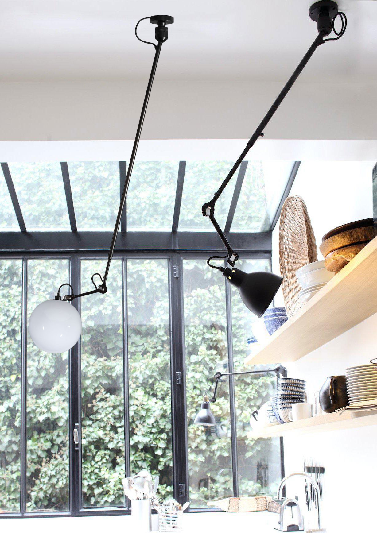 Потолочный светильник Lampe Gras N°302 L Glassball выделяется своим продуманным промышленным дизайном и функциональностью. Он оснащён выдвижным телескопическим кронштейном с шарнирным соединением, что позволяет регулировать высоту светильника в диапазоне от 112 до 198 сантиметров. Это обеспечивает гибкость в организации освещения и позволяет оптимально настроить уровень освещённости.