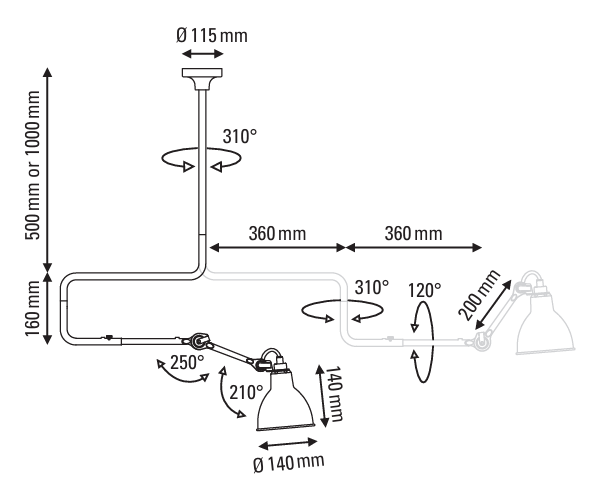 Потолочный светильник Lampe de Gras N°312 сочетает в себе функциональность и элегантный дизайн. Это делает его удачным выбором для самых разных интерьеров — от жилых пространств до офисных помещений. Конструкция светильника продумана для максимальной гибкости в использовании. Кронштейн с двойным шарниром позволяет поворачивать его на полные 360°. Благодаря этому свет можно направить в любую нужную точку пространства.