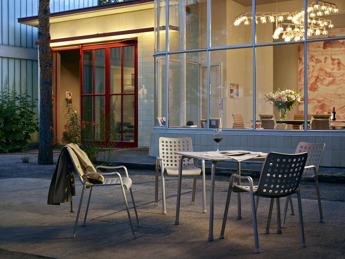 Стул Landi — это классика, положившая начало трехмерному формованию сидения и каркаса стула. Каркас полностью алюминиевого стула состоит из двух частей. Пара u-образных профилей, соединенных сварными поперечными балками, образует самонесущую раму, которая одновременно выполняет функцию ножек стула и низких подлокотников. Перфорированные отверстия не только обеспечивают легкий вес, но и придают изящества внешнему виду стула. Стулья могут составляться друг на друга и использоваться как в помещениях, так и на открытом воздухе. Более подробную информацию можно уточнить у менеджера.