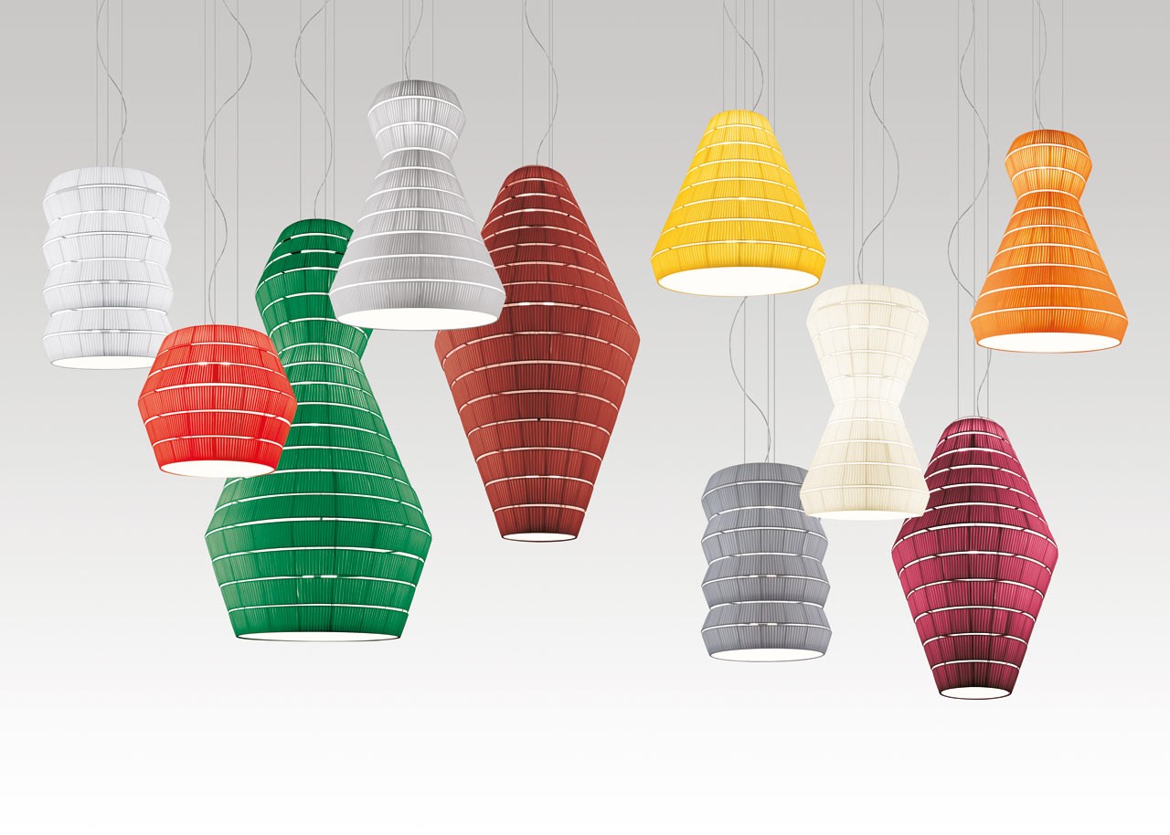 Коллекция потолочных и подвесных светильников с металлическим каркасом, покрытым полосками из очень гладкой огнеупорной ткани Ponge, доступной в десяти цветах: темно-серый, светло-серый, оранжевый, зеленый, золотисто-желтый, красный, бордовый красный, белый, теплый белый, кирпичный и разноцветные. Широкий спектр форм и размеров делает эти светильники универсальными, поэтому их можно использовать и в помещениях больших размеров, так и в небольших комнатах. Незамысловатость форм перекрывается материалами и разнообразием цветов.