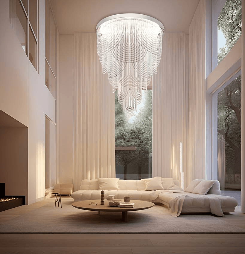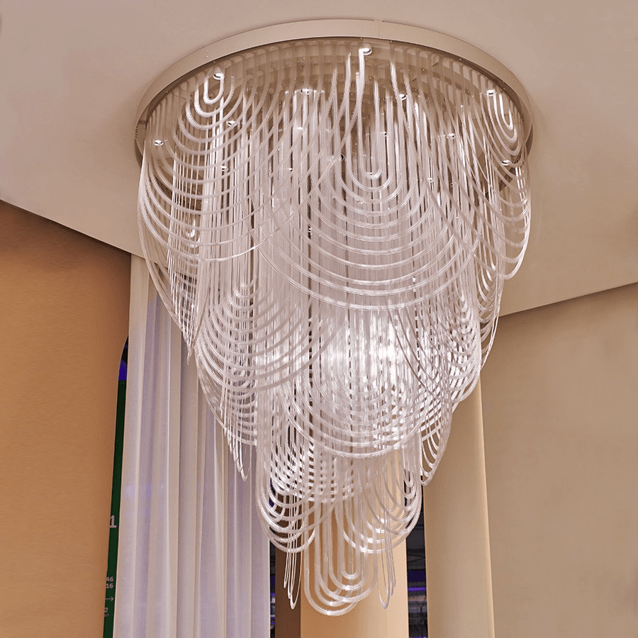 Этот светильник отличается внушительными размерами, что позволяет ему стать центральным акцентом в просторных помещениях, будь то гостиная, холл или конференц-зал. Однако его лёгкая и продуманная конструкция обеспечивает удобство монтажа и эксплуатации, что делает его идеальным решением для масштабных проектов.