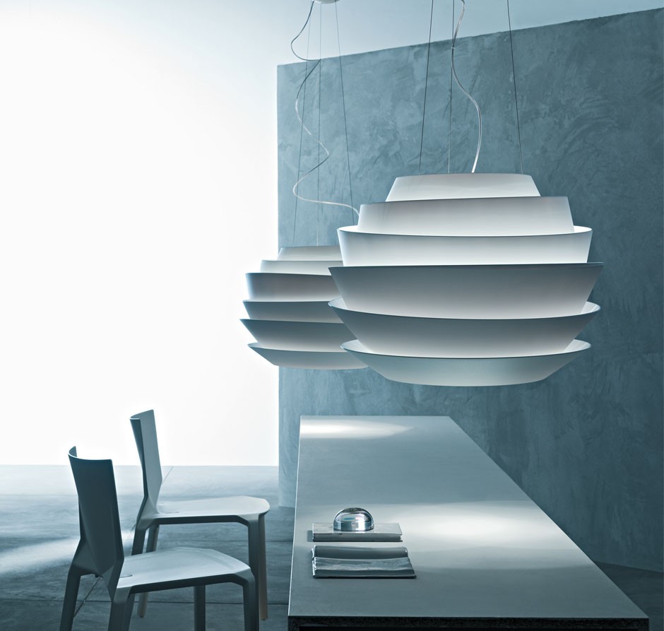 Светильник Le Soleil состоит из каскада несимметричных колец разного диаметра. Изготовленные из специального поликарбоната, эти полосы полностью скрывают источник света, предотвращая ослепление. Неровные края колец создают сложную игру света и тени на внешней поверхности плафона, что делает его похожим на мягкое, «ласковое» утреннее солнце. Модель обеспечивает три типа световых потоков: направленный вниз (на поверхность стола), отраженный вверх (от потолка) и мягкий рассеянный свет, проходящий сквозь зазоры между кольцами.