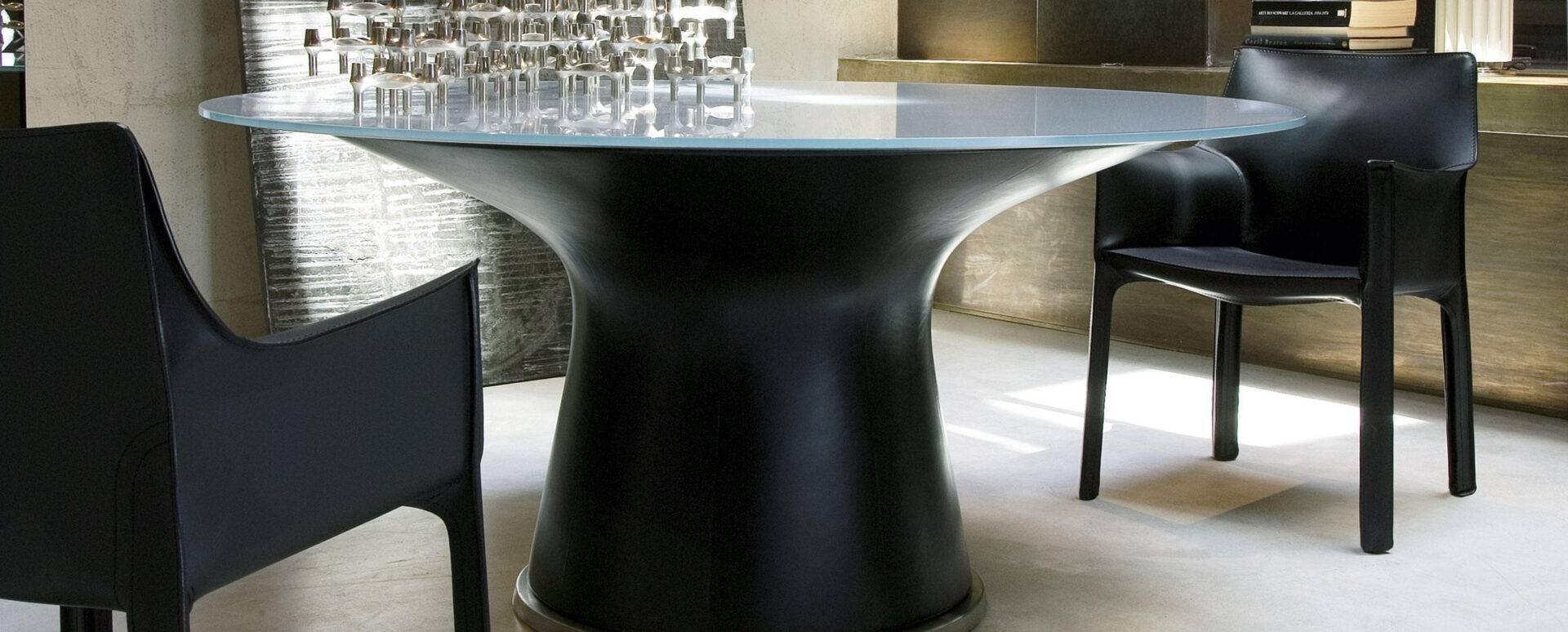 Современный круглый стол с основанием из нержавеющей стали. Столешница сделана из прозрачного стекла серого цвета. Основание покрыто глянцевой краской. Также оно может быть обтянуто натуральной кожей различных цветов. Если у Вас возникли вопросы по этому товару, свяжитесь с нами, и мы Вам обязательно поможем.