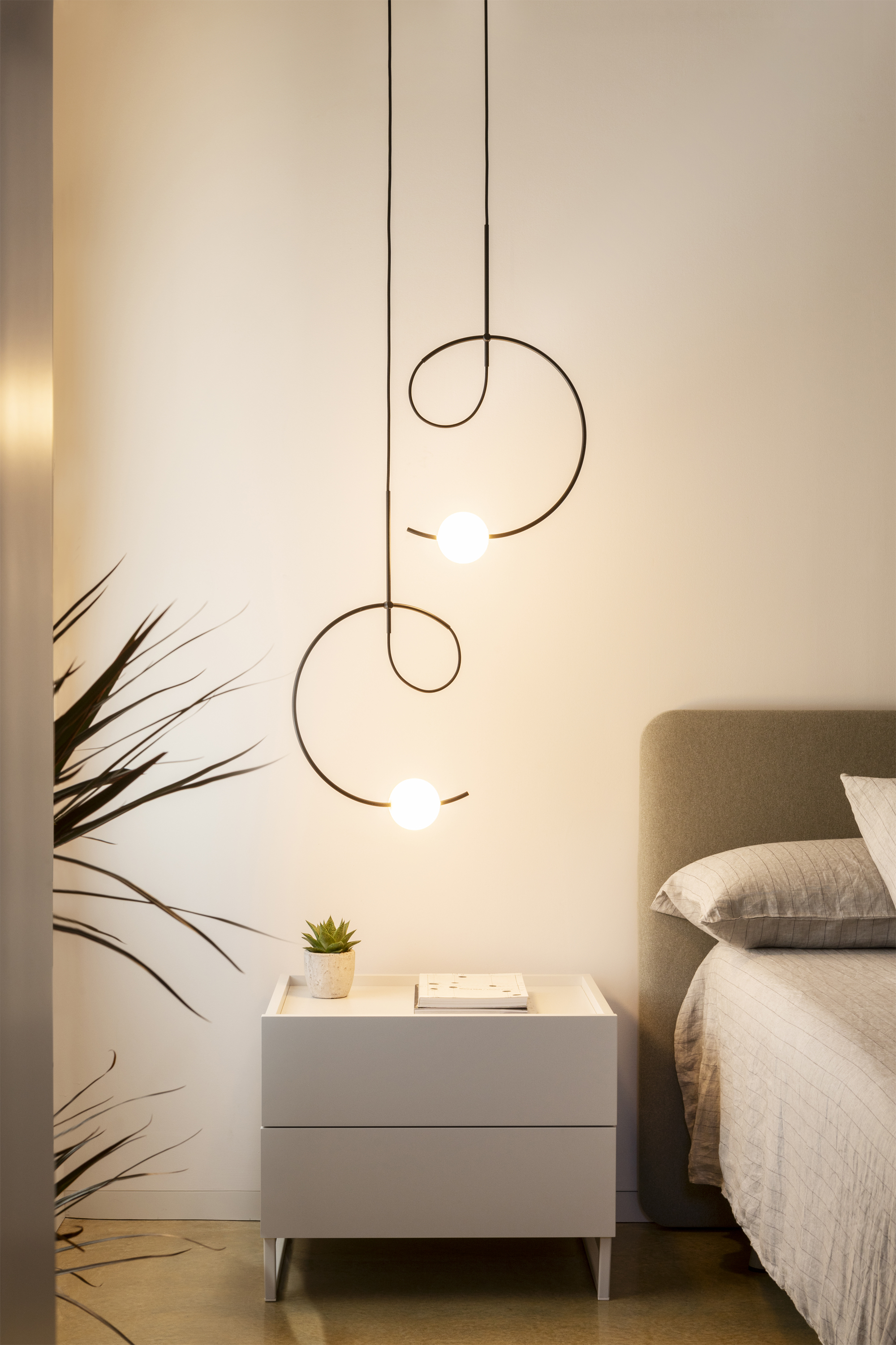 Светильник удобно настраивать: высоту можно менять, максимально — до 300 см. Доступны два варианта крепления: можно установить один светильник или объединить несколько единиц с отдельными креплениями к потолку. Это позволяет создавать интересные световые композиции и подчёркивать зонирование пространства.