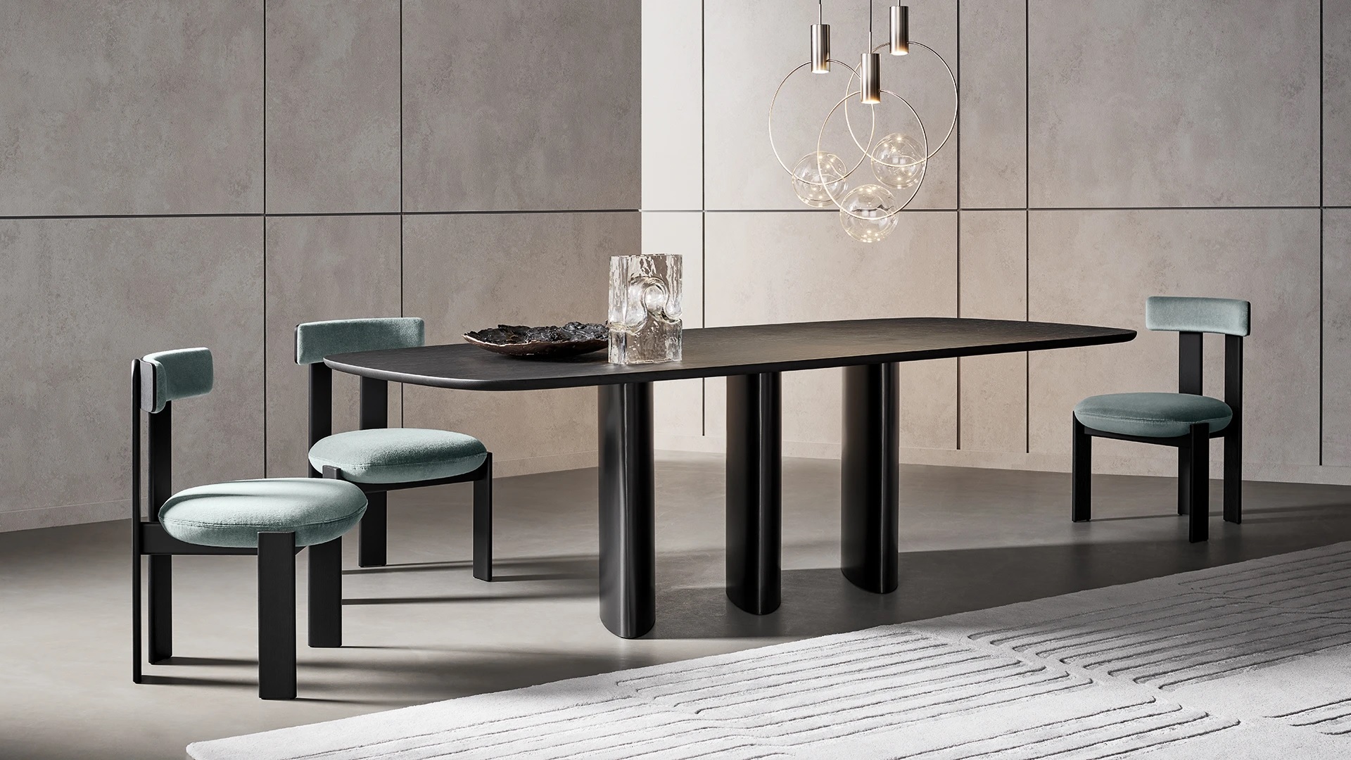 Форма стола черпает вдохновение из образа прохода — идеально напоминающего вход в древний храм. Три изогнутые ножки задают ритм конструкции: они могут казаться то стройными, то массивными, в зависимости от ракурса и освещения. Свет играет с формами, усиливая контраст между лёгкостью и объёмом.