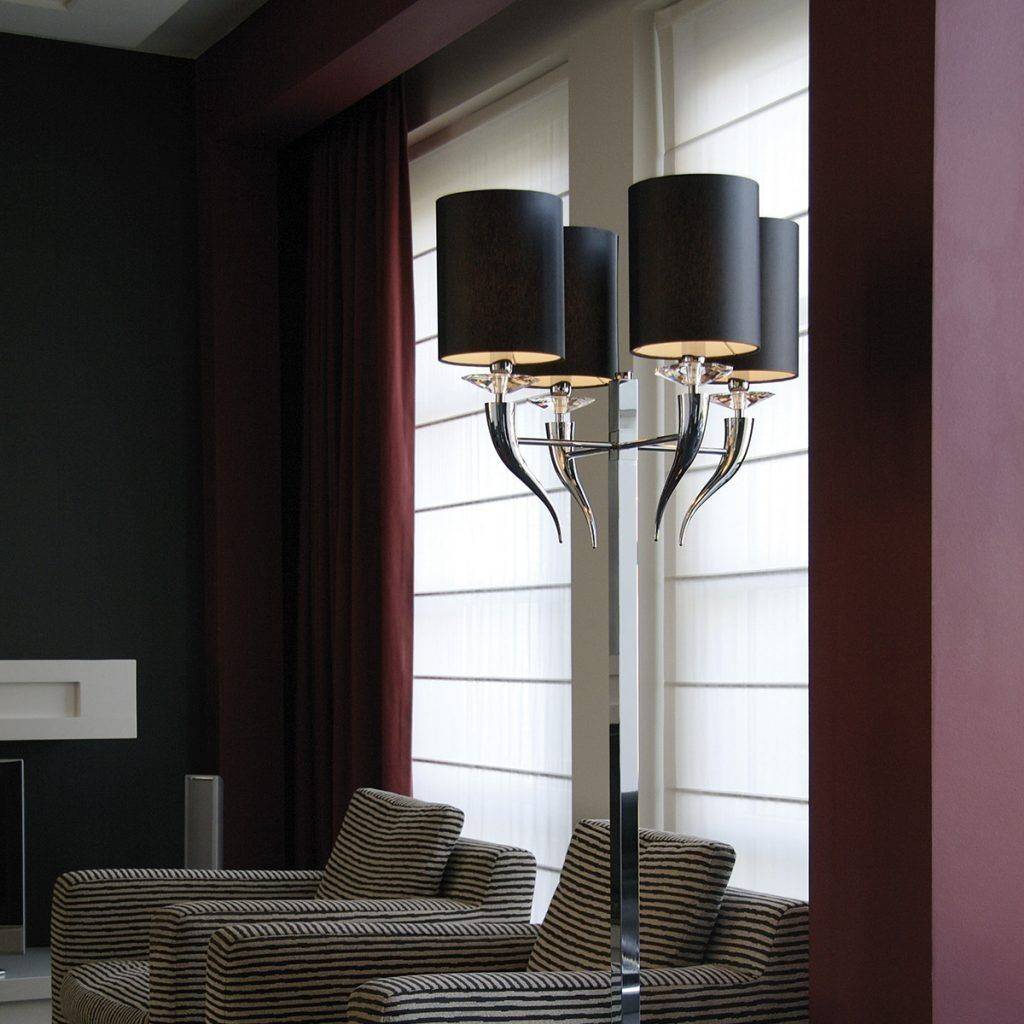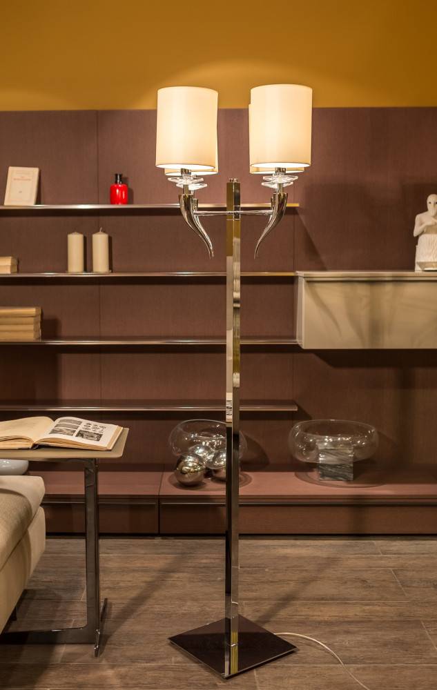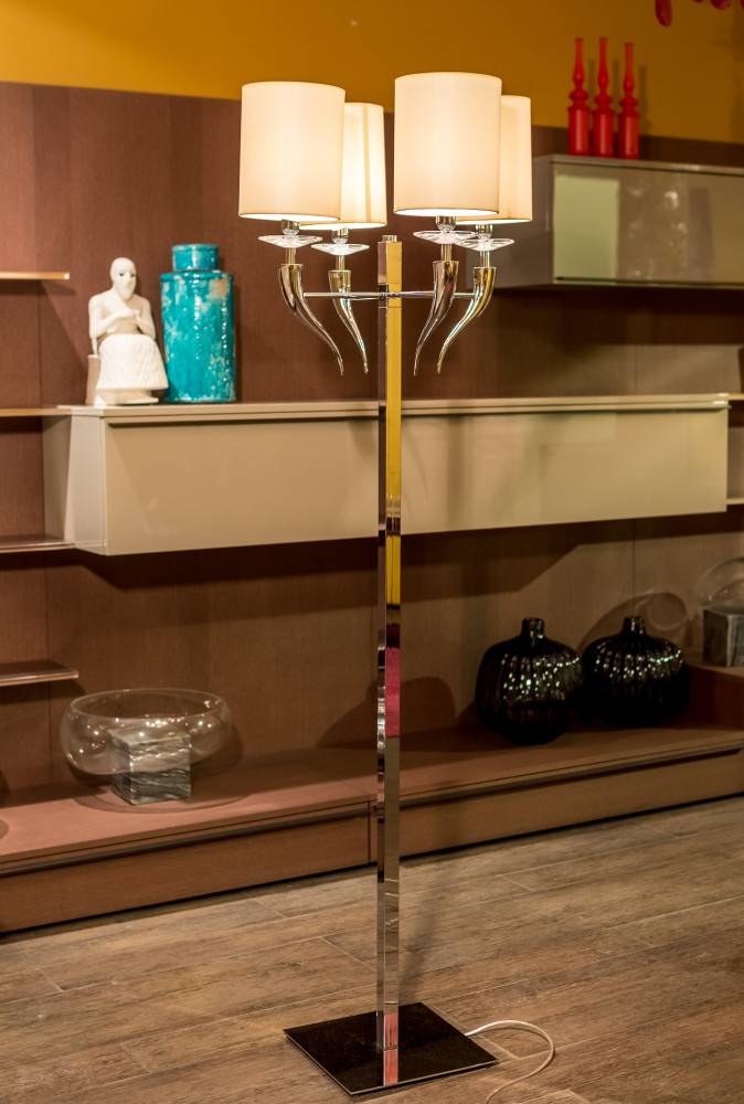 Эстетика светильника строится на смелом контрасте: строгая хромированная ножка, символизирующая современную элегантность, гармонично сочетается с живописно изогнутыми рожками и утяжеленным основанием. На этих изгибах, словно драгоценности, покоятся четыре цилиндрических абажура из благородного текстиля, чьи мягкие формы и рассеянный свет создают атмосферу тепла и уюта. Тончайшие кристаллы добавляют мерцающий акцент, рождая в интерьере игру бликов и завораживающую магию сияния.