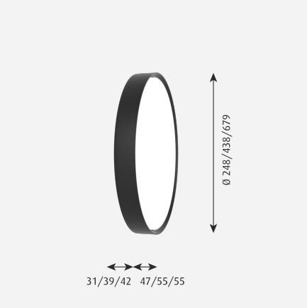 Модель доступна в трёх диаметрах — Ø 250 мм, Ø 440 мм и Ø 680 мм, что позволяет гибко подбирать светильник в зависимости от масштаба стены и требуемой интенсивности света. Малый формат подходит для акцентного освещения или ритмичной композиции, средний — универсален для равномерной подсветки стен, крупный — становится доминирующим элементом, формирующим световую доминанту в просторных интерьерах.