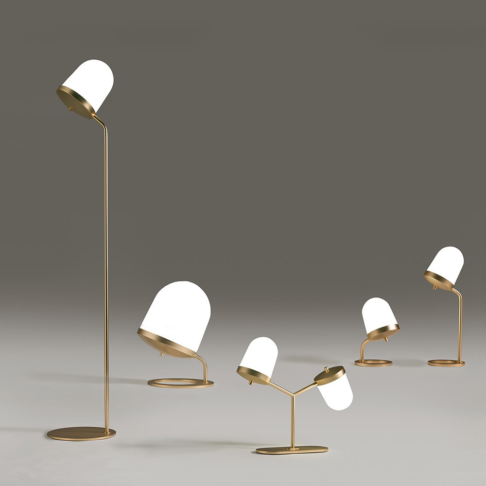 Торшер Lula - одно из самых сложных творений дизайнера Umberto Asnago. Ножка и основание светильника выполнены из металла, и доступны в двух вариантах отделки: атласное золото или лакированный табак. Плафон изготовлен из выдувного белого стекла. Также в серию входит настольная лампа.